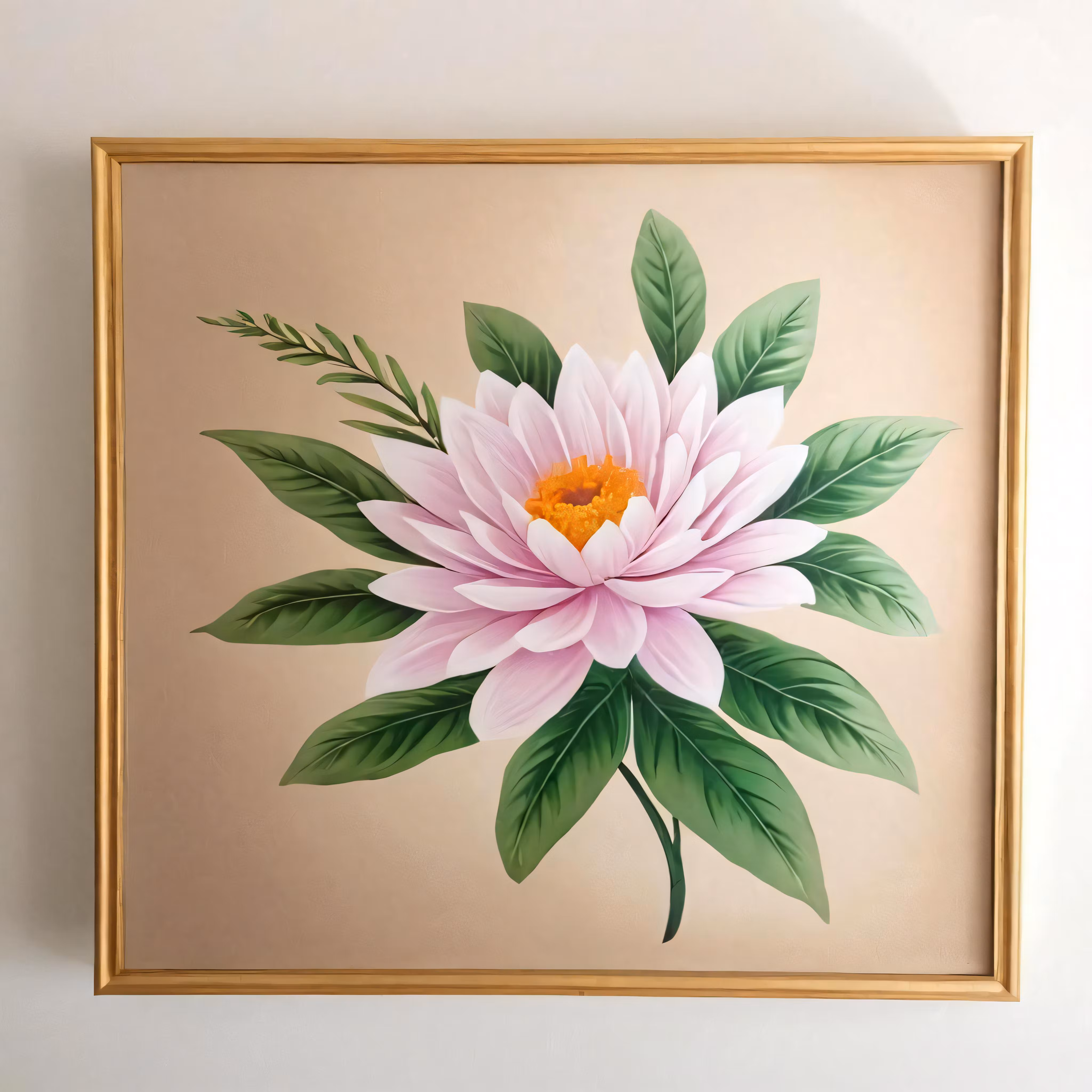 High resolution picture, free to use, an artfully decorated frame is hung on the wall of a painting of a pink flower