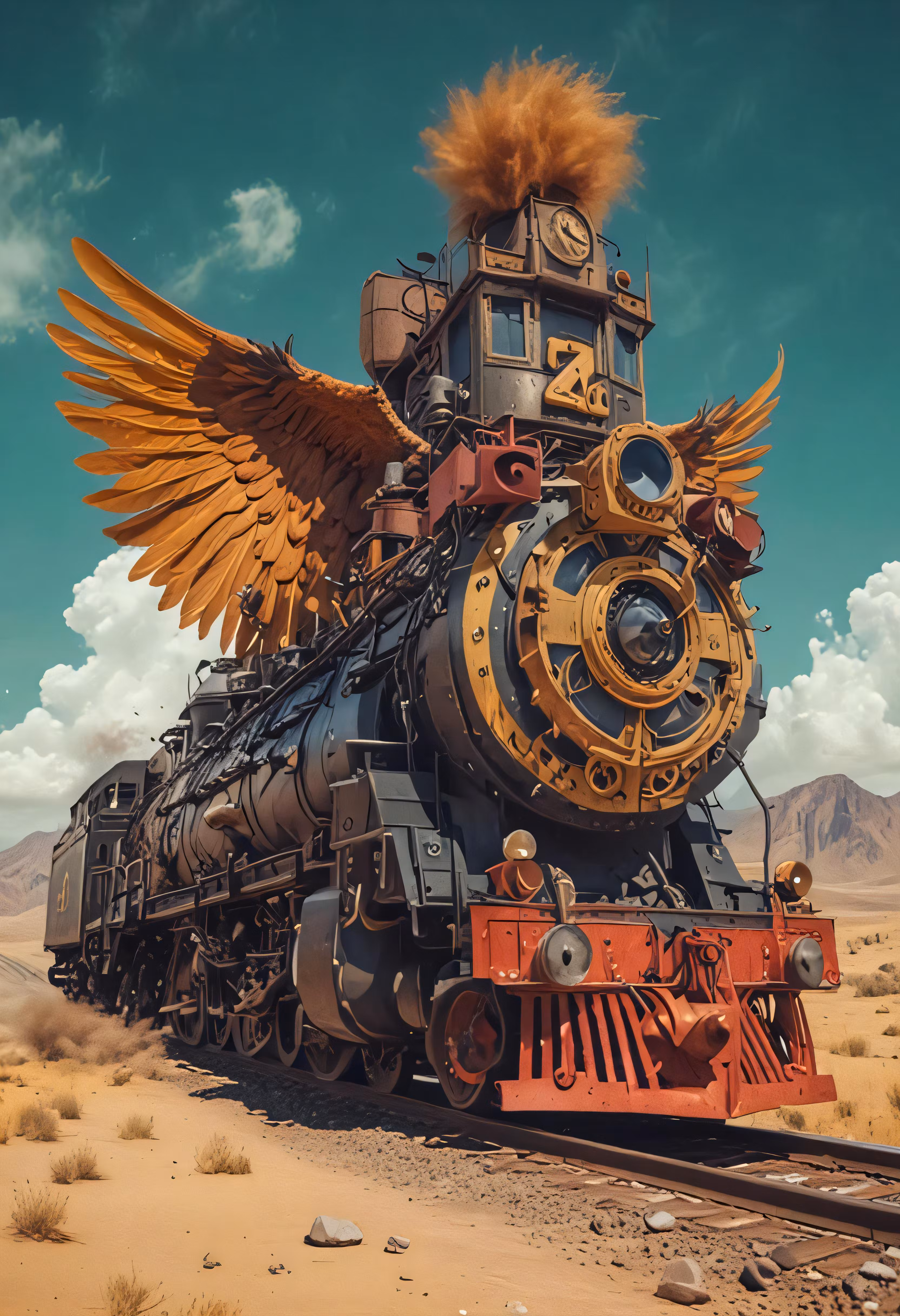 High resolution picture, free to use, an artistic steam   powered train traveling through the desert