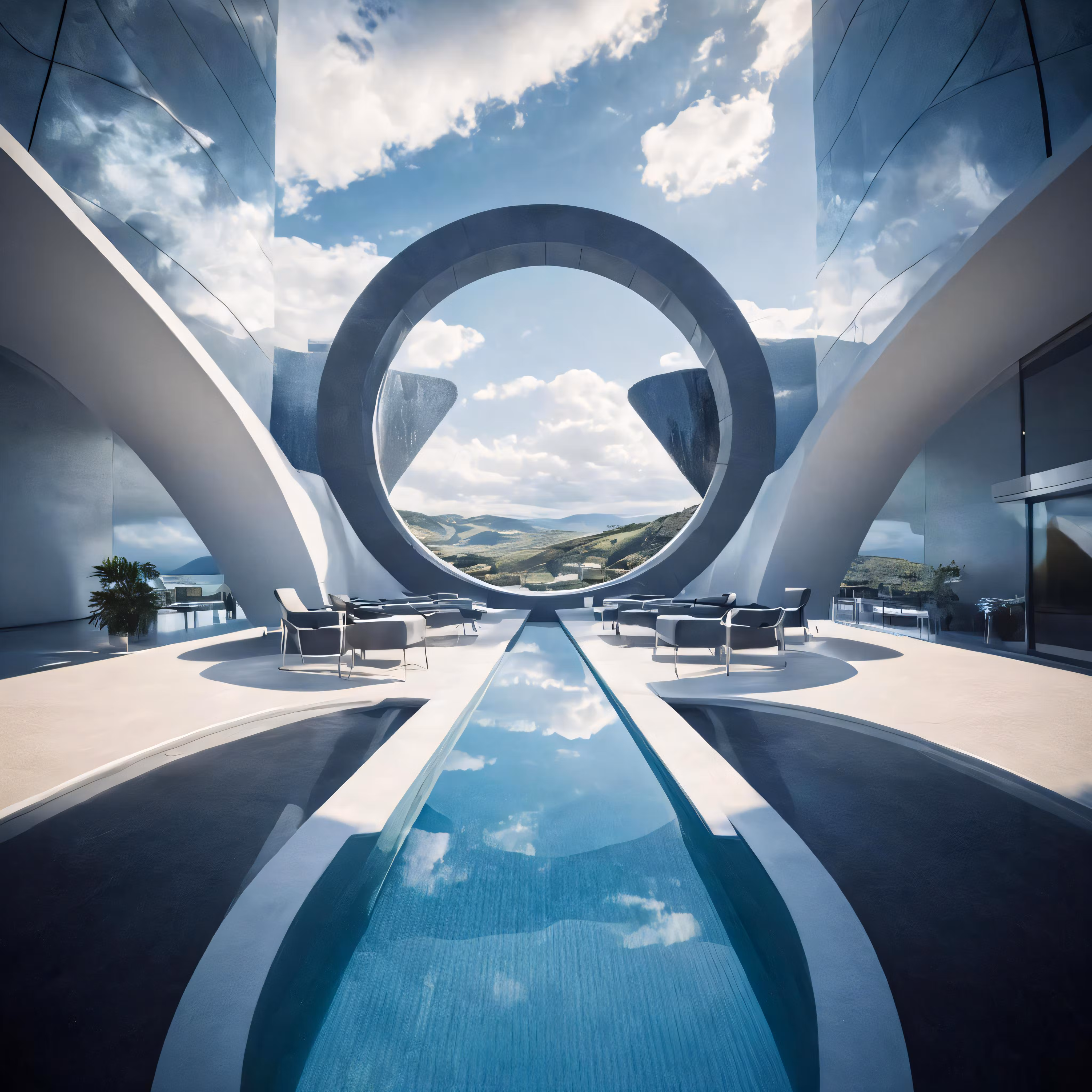 High resolution picture, free to use, an artistically designed swimming pool sits in the middle of a building