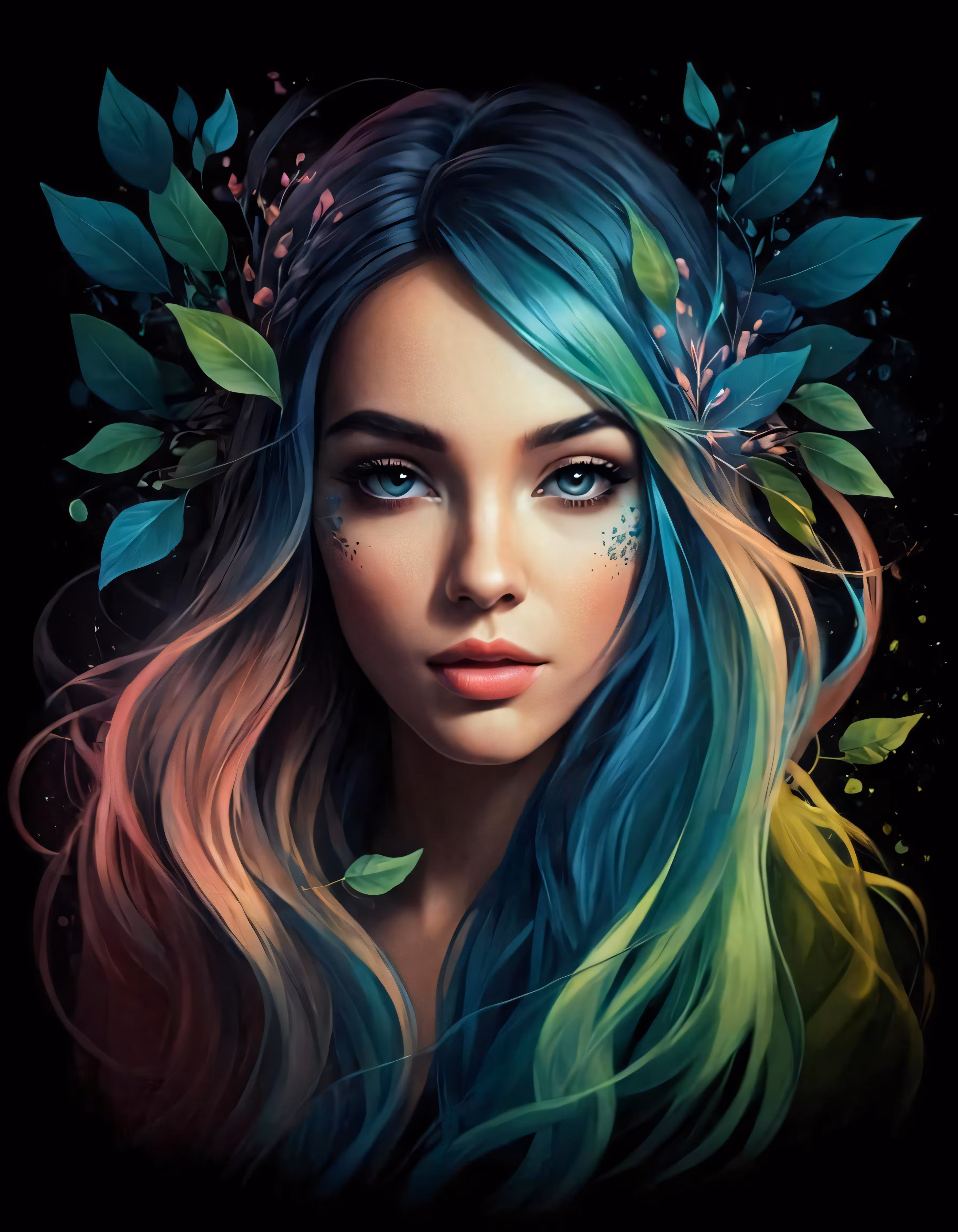 High resolution picture, free to use, an artwork work of a woman with multi colored hair and flowers