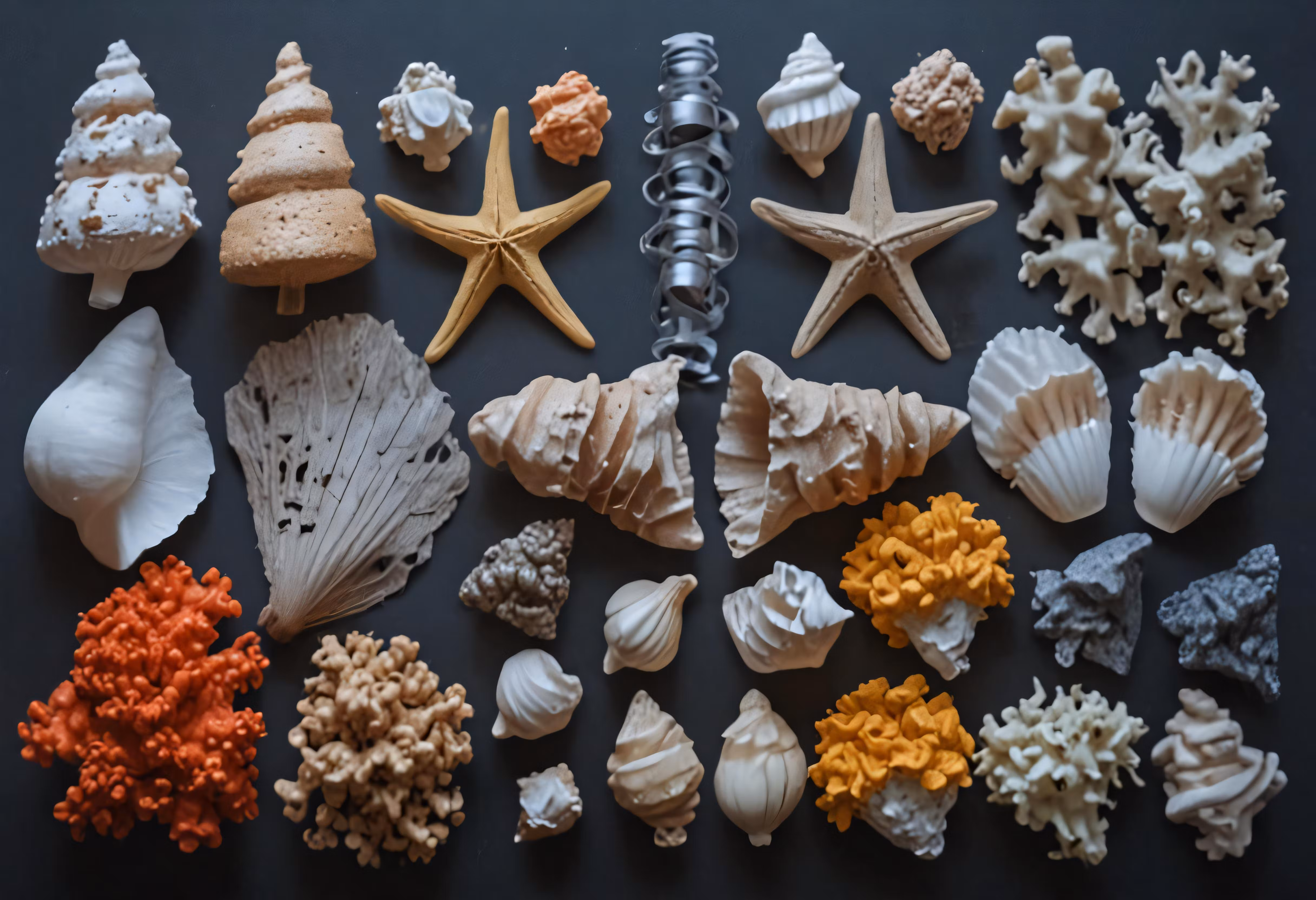 High resolution picture, free to use, an assortment of colorful corals, seashells, starfish and sand dollars