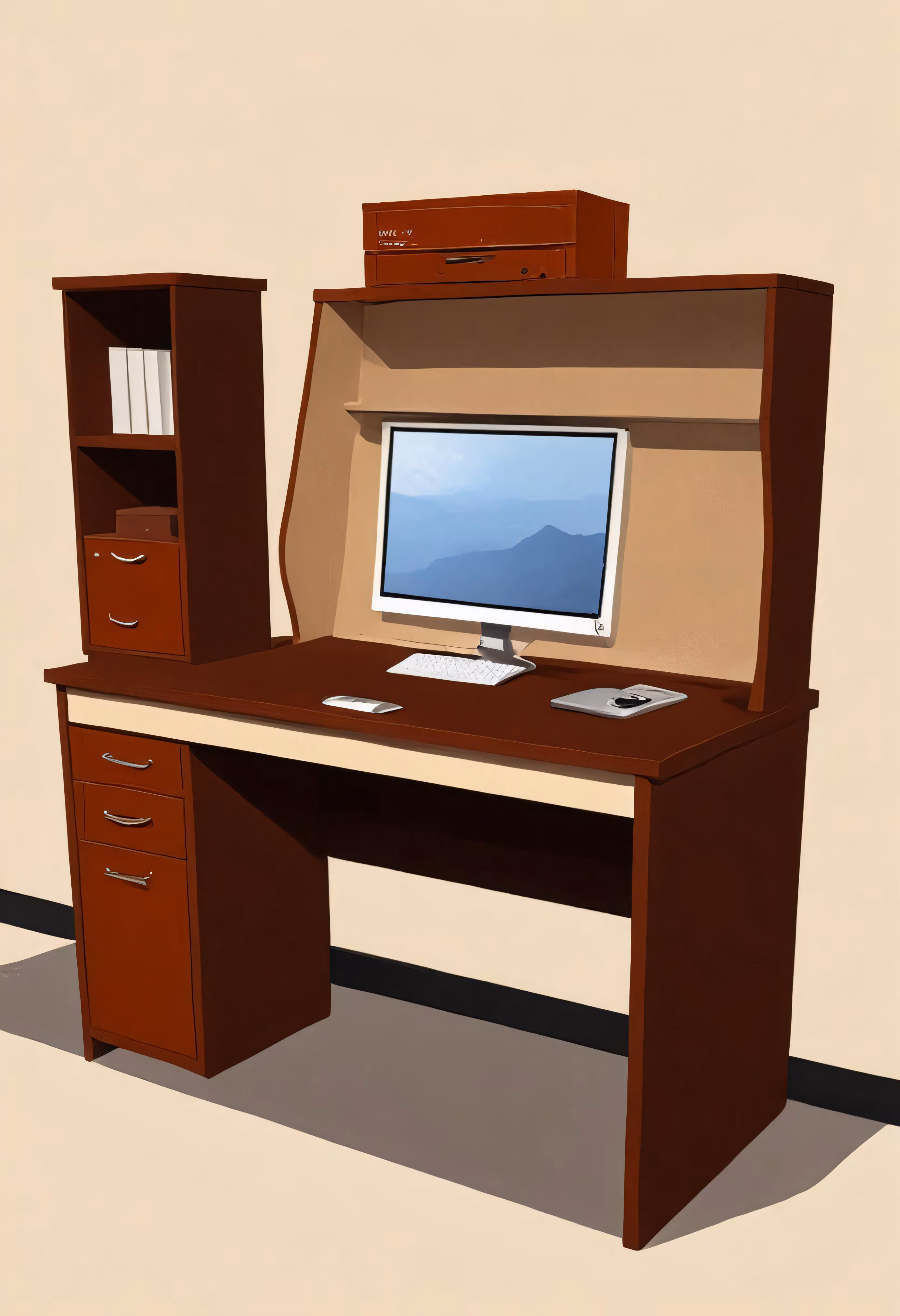 High resolution picture, free to use, an computer and shelf are shown with shelves on it