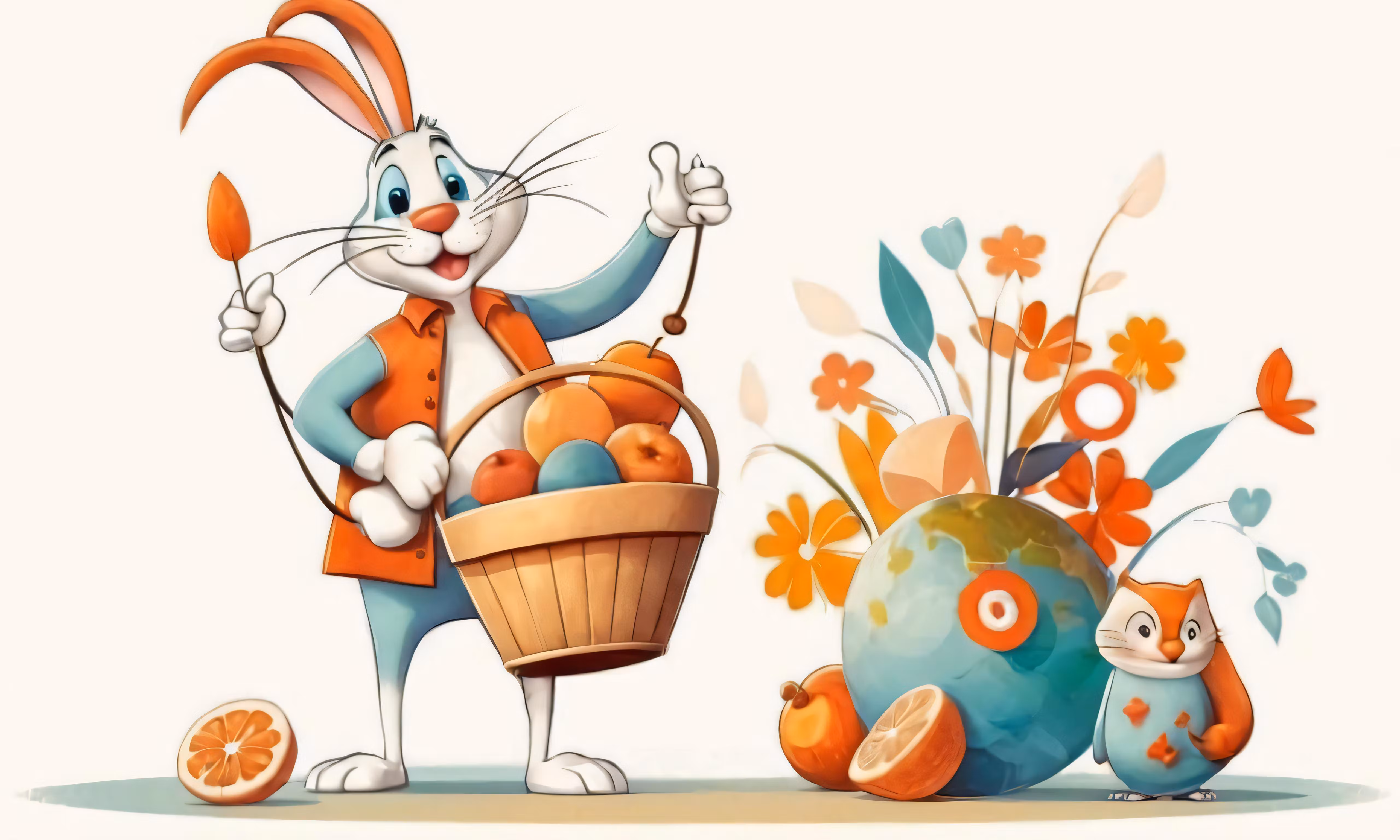 High resolution picture, free to use, an easter bunny with carrots and a basket in front of flowers