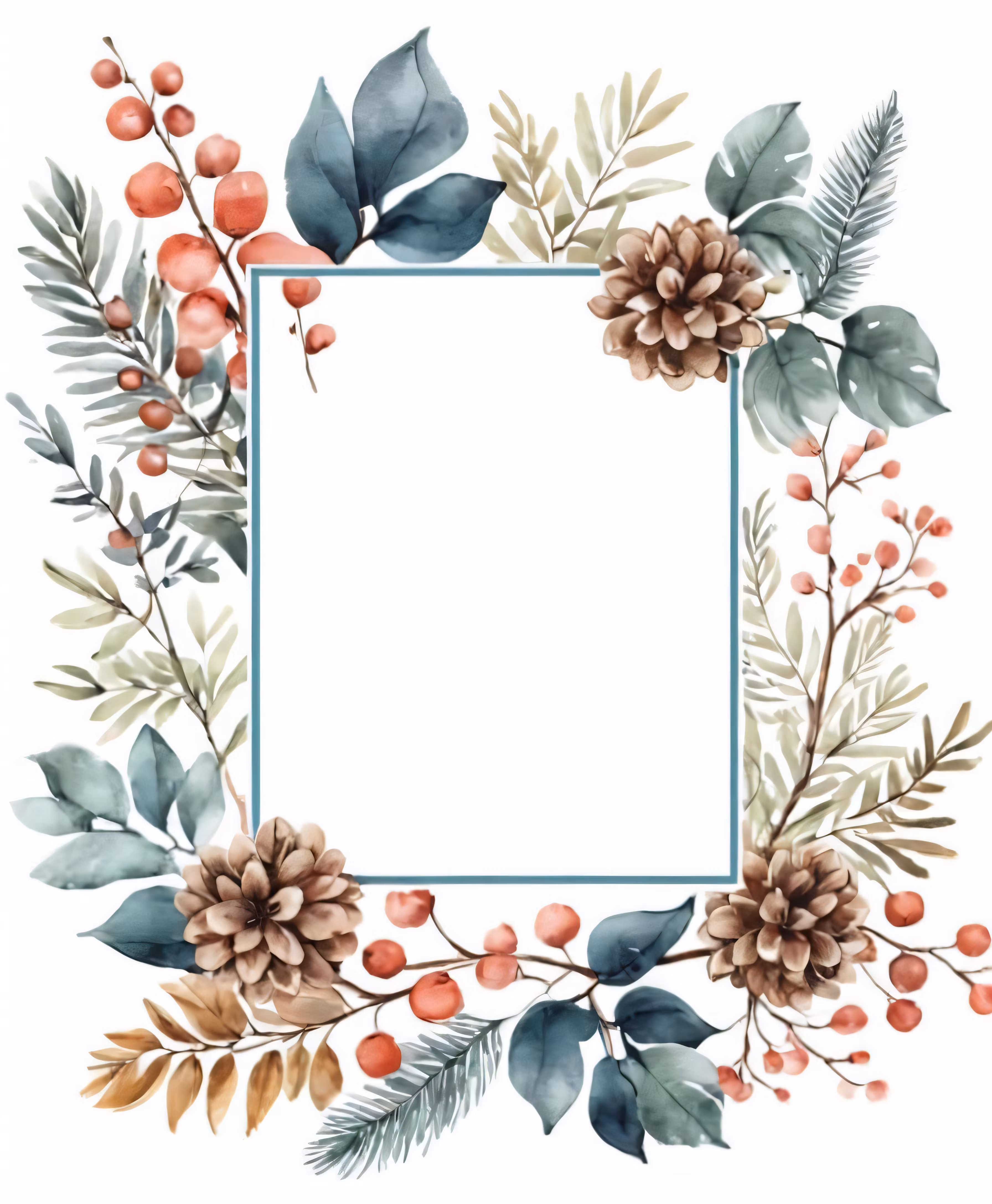 High resolution picture, free to use, an elegant square with evergreen berries, pine and blue frame