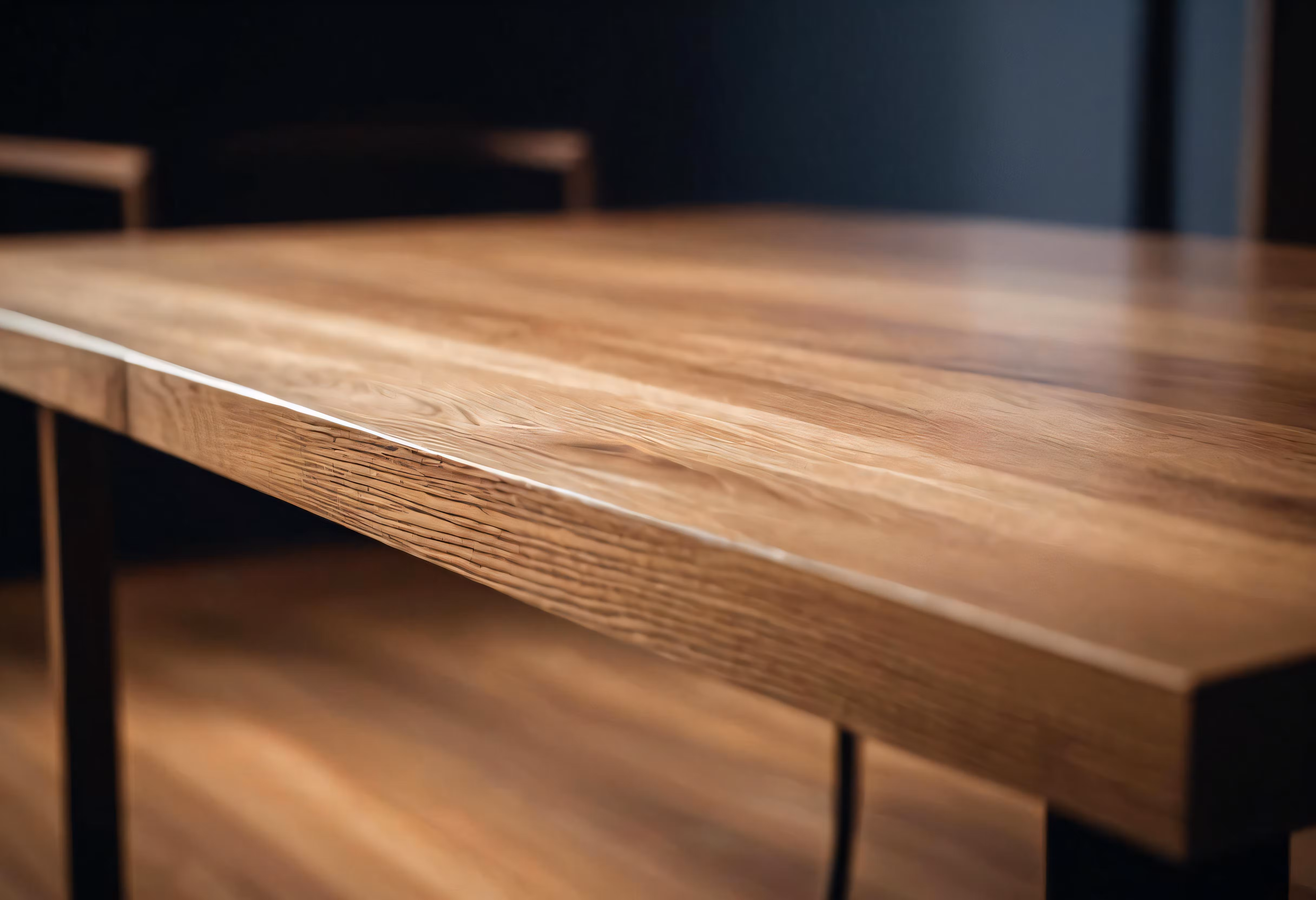 High resolution picture, free to use, an empty wooden table with chairs and a chair in the background