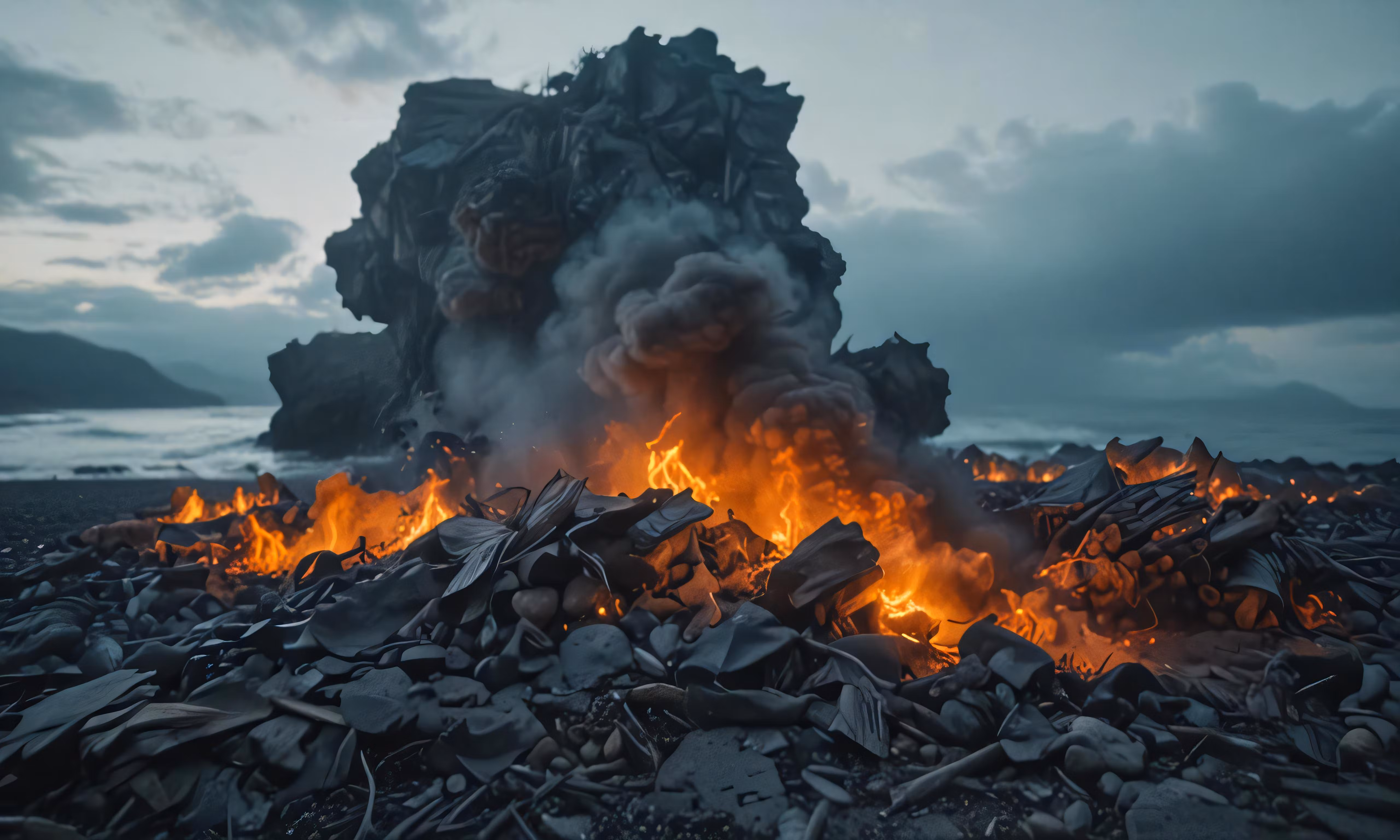 High resolution picture, free to use, an enormous cloud of fire and coal on a dark beach