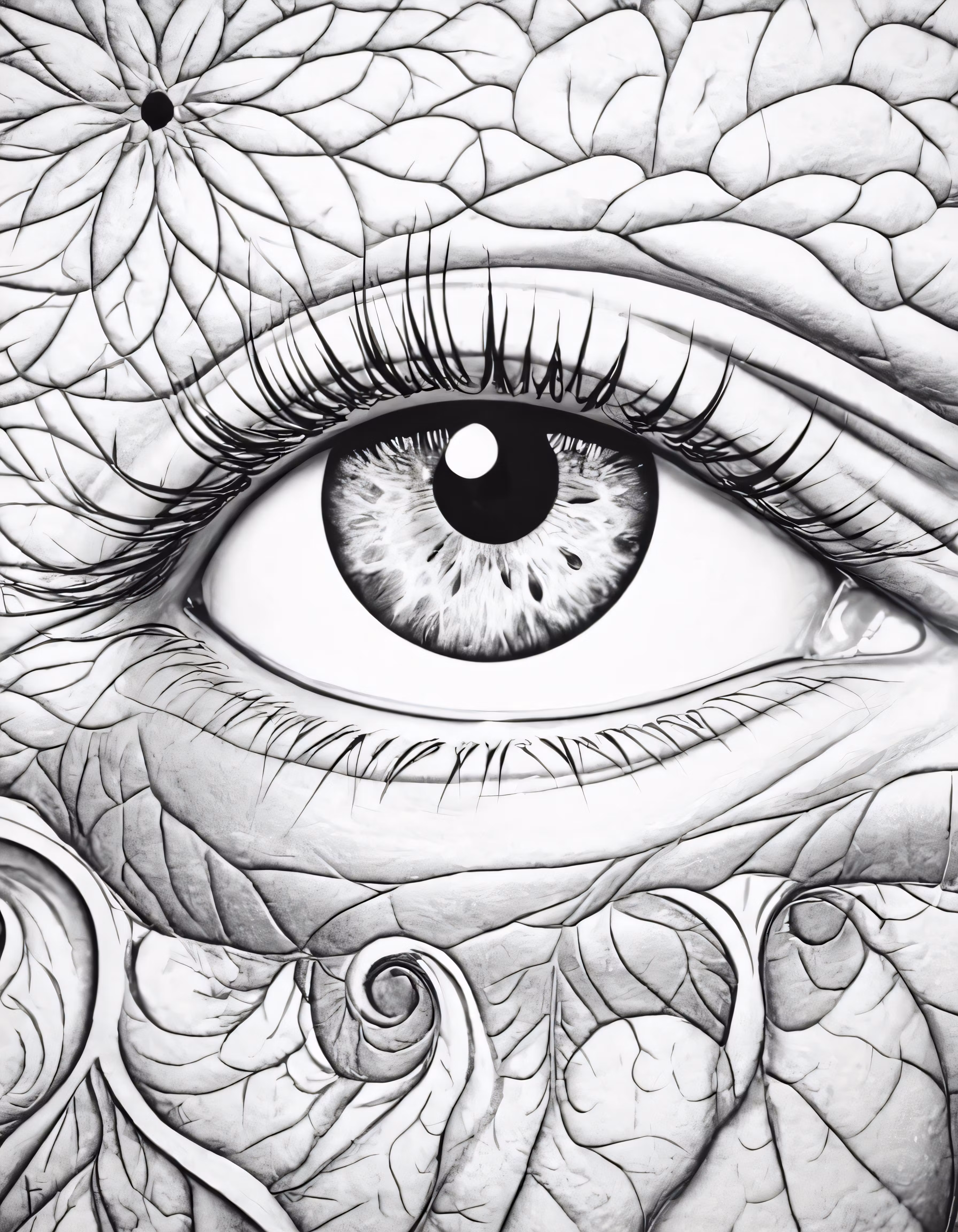 High resolution picture, free to use, an eye has many petals on it and is surrounded by spirally shaped leaves