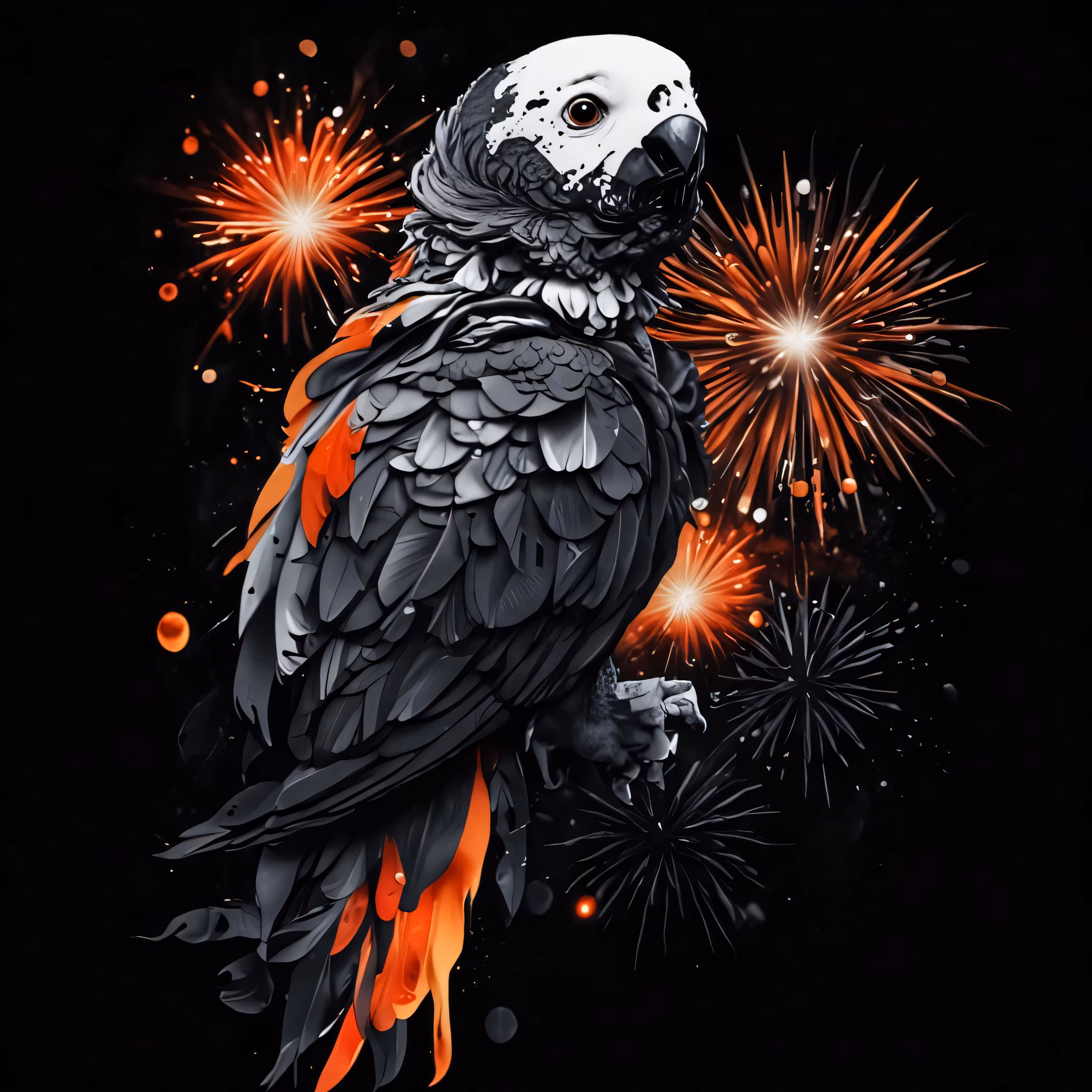 High resolution picture, free to use, an illustrated image of a parrot perched on top of a firework display