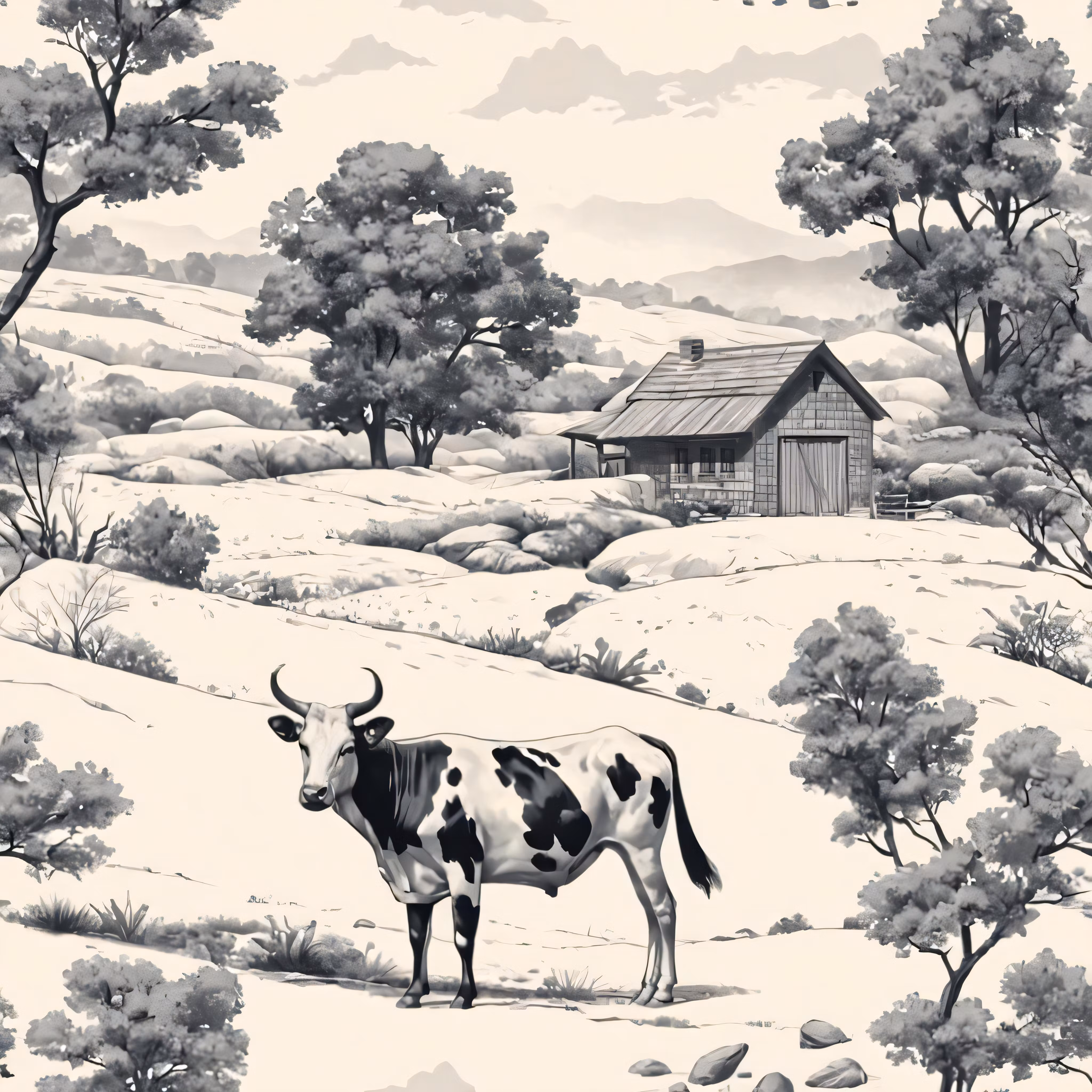 High resolution picture, free to use, an illustration of a cow in front of a farmhouse