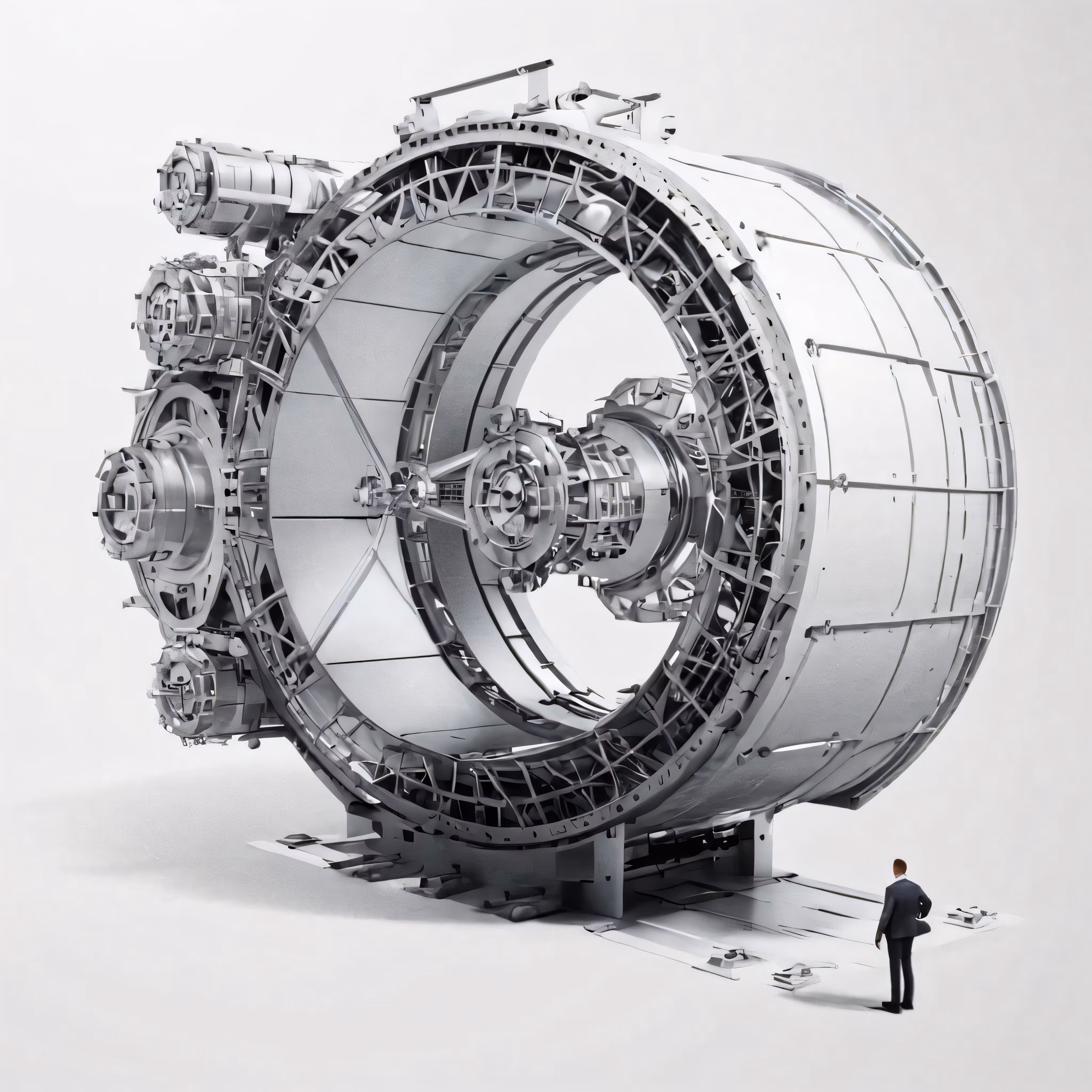 High resolution picture, free to use, an illustration of a man standing in front of a very large machine