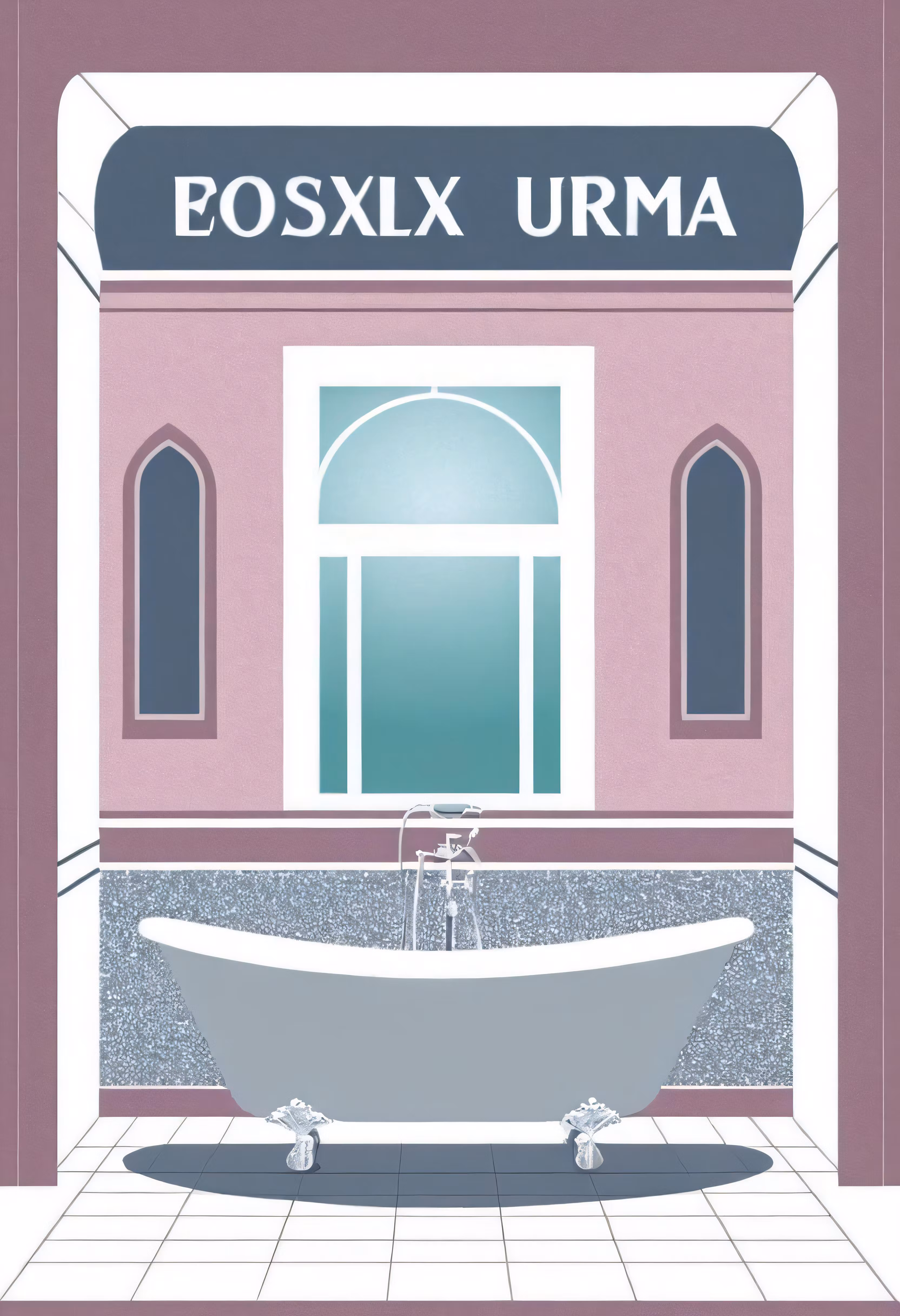 High resolution picture, free to use, an illustration of a pink bathroom with tub and arched windows