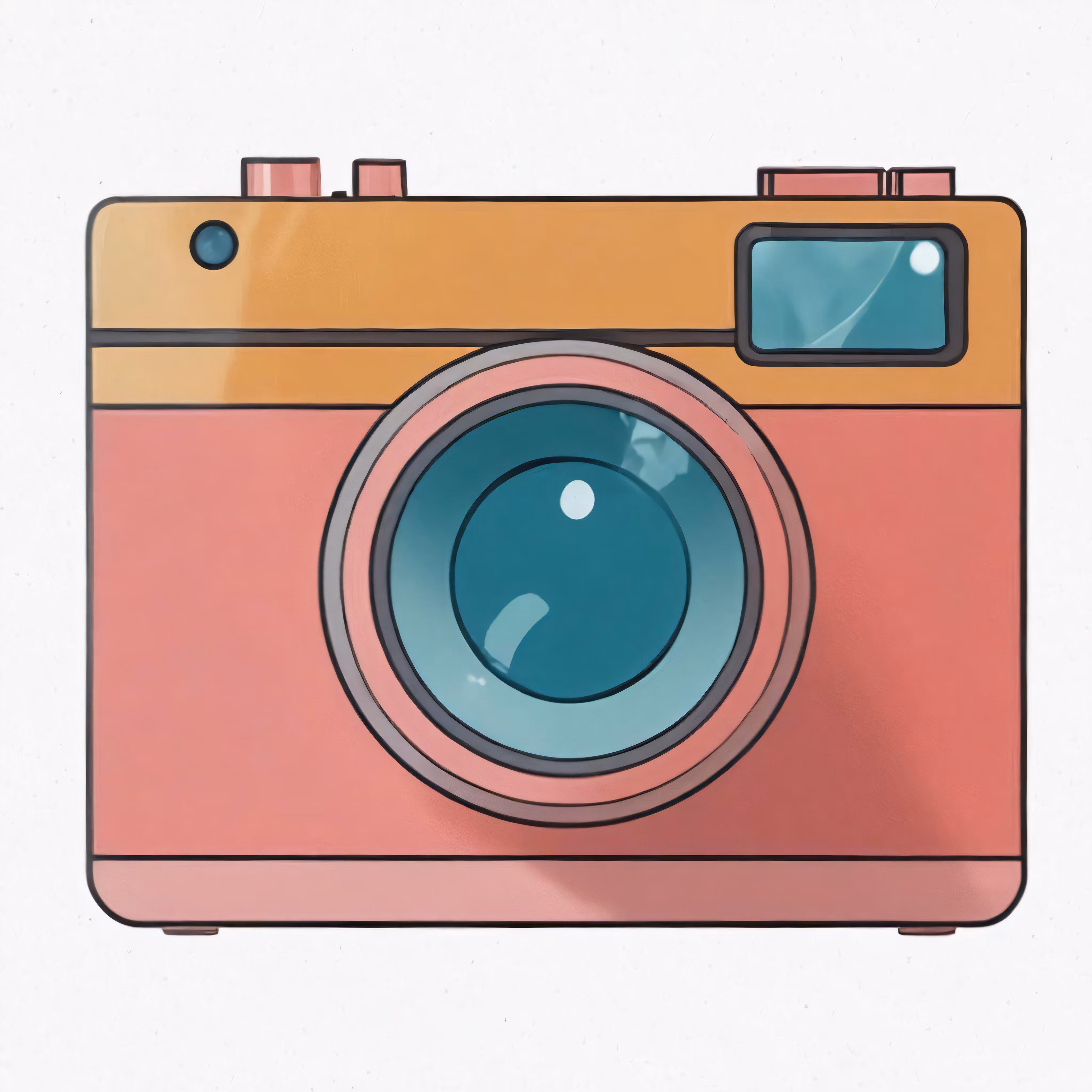 High resolution picture, free to use, an illustration of a pink camera with a blue lens