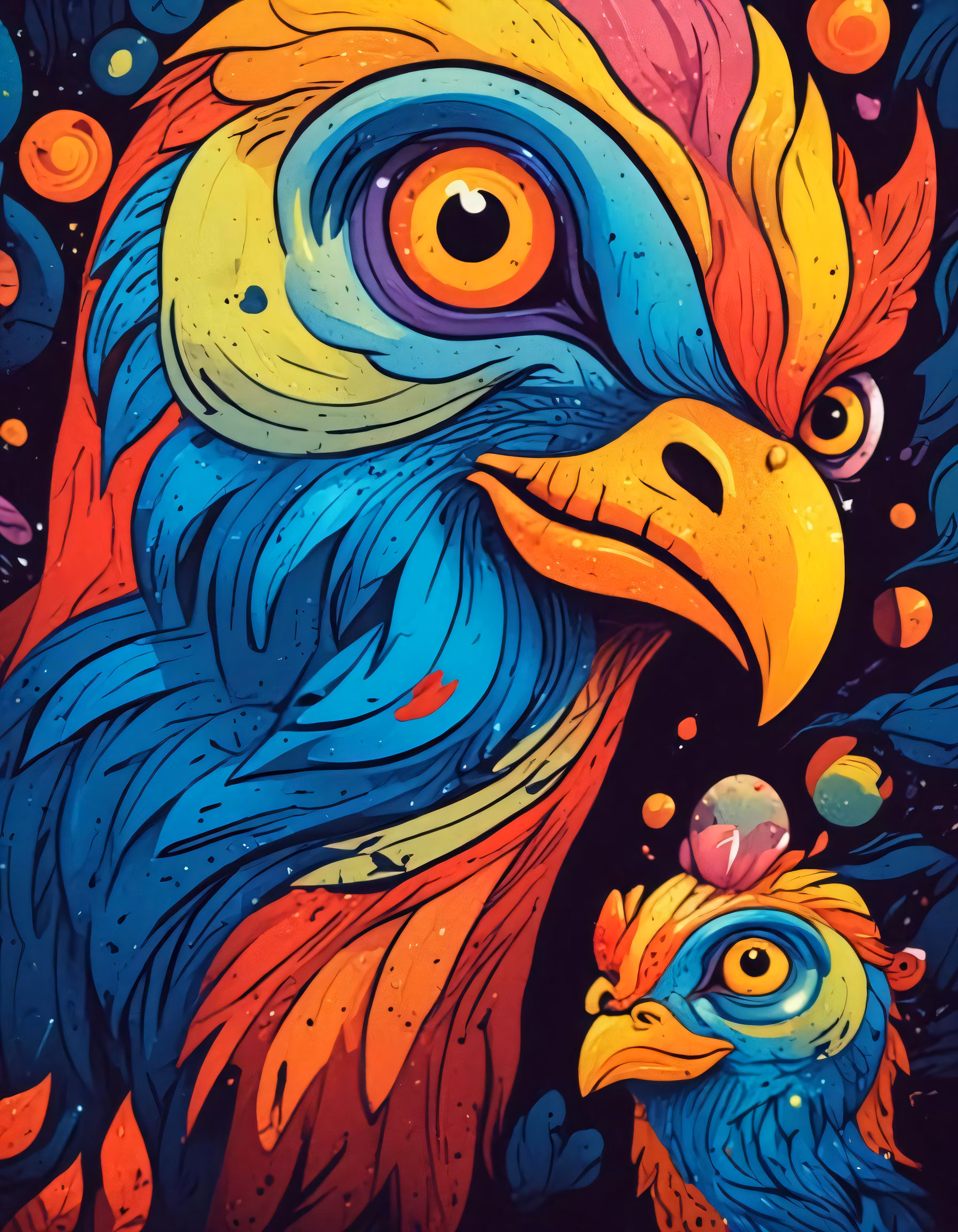 High resolution picture, free to use, an illustration of a rooster and a chick