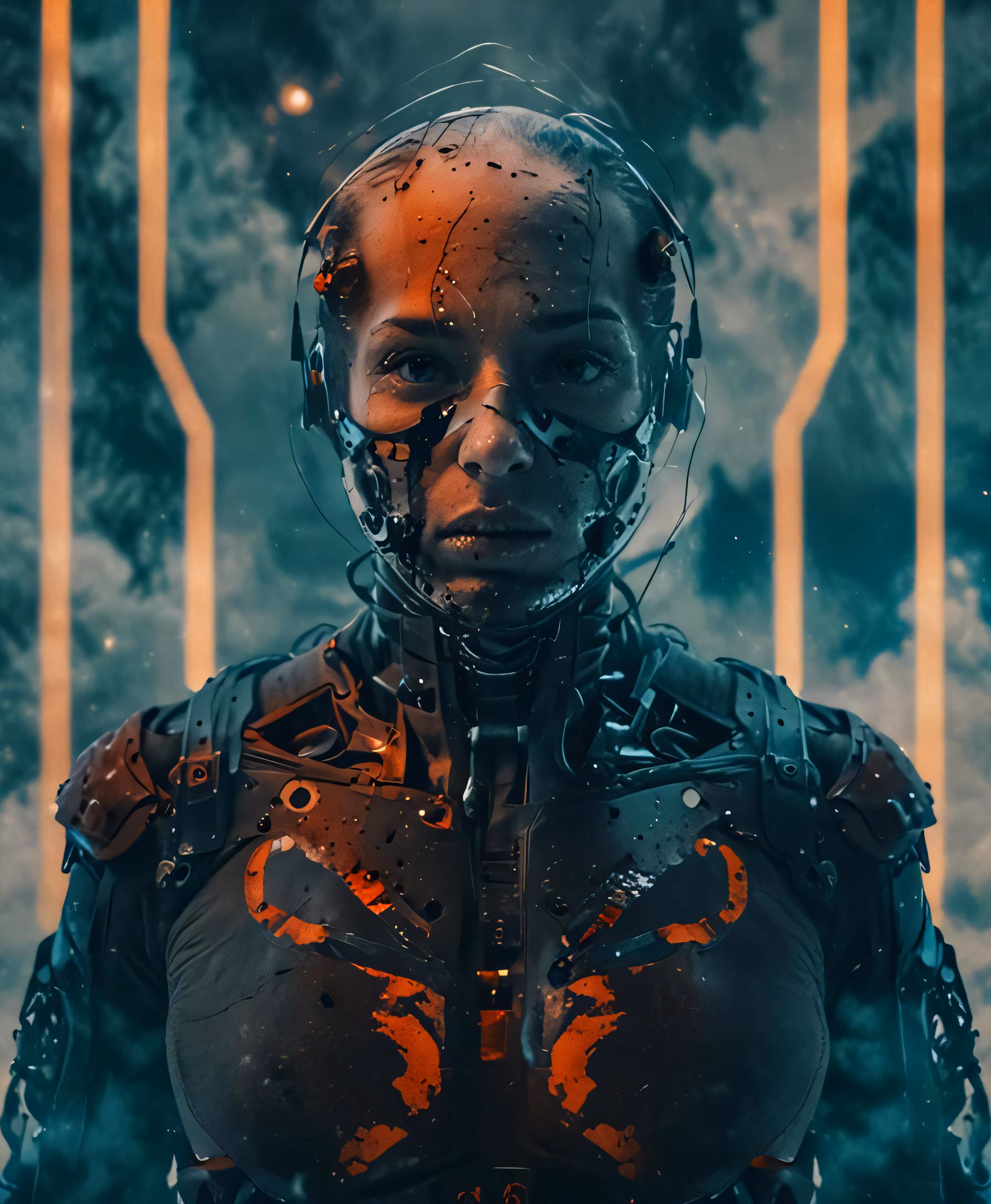 High resolution picture, free to use, an illustration of a woman in black with a futuristic face and a helmet