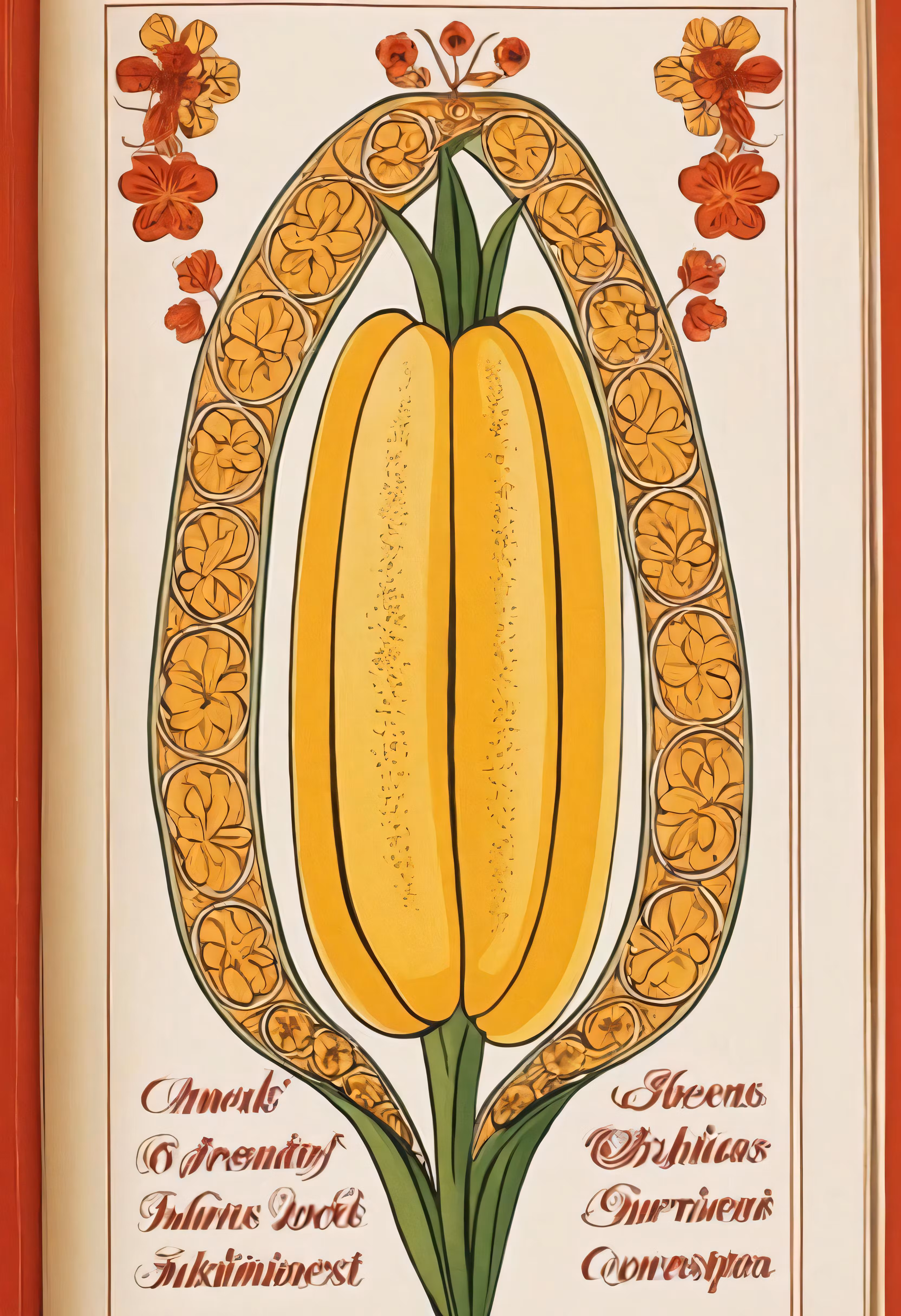 High resolution picture, free to use, an illustration shows two gourds and the words, ornamental ornament, surrounded by flowers