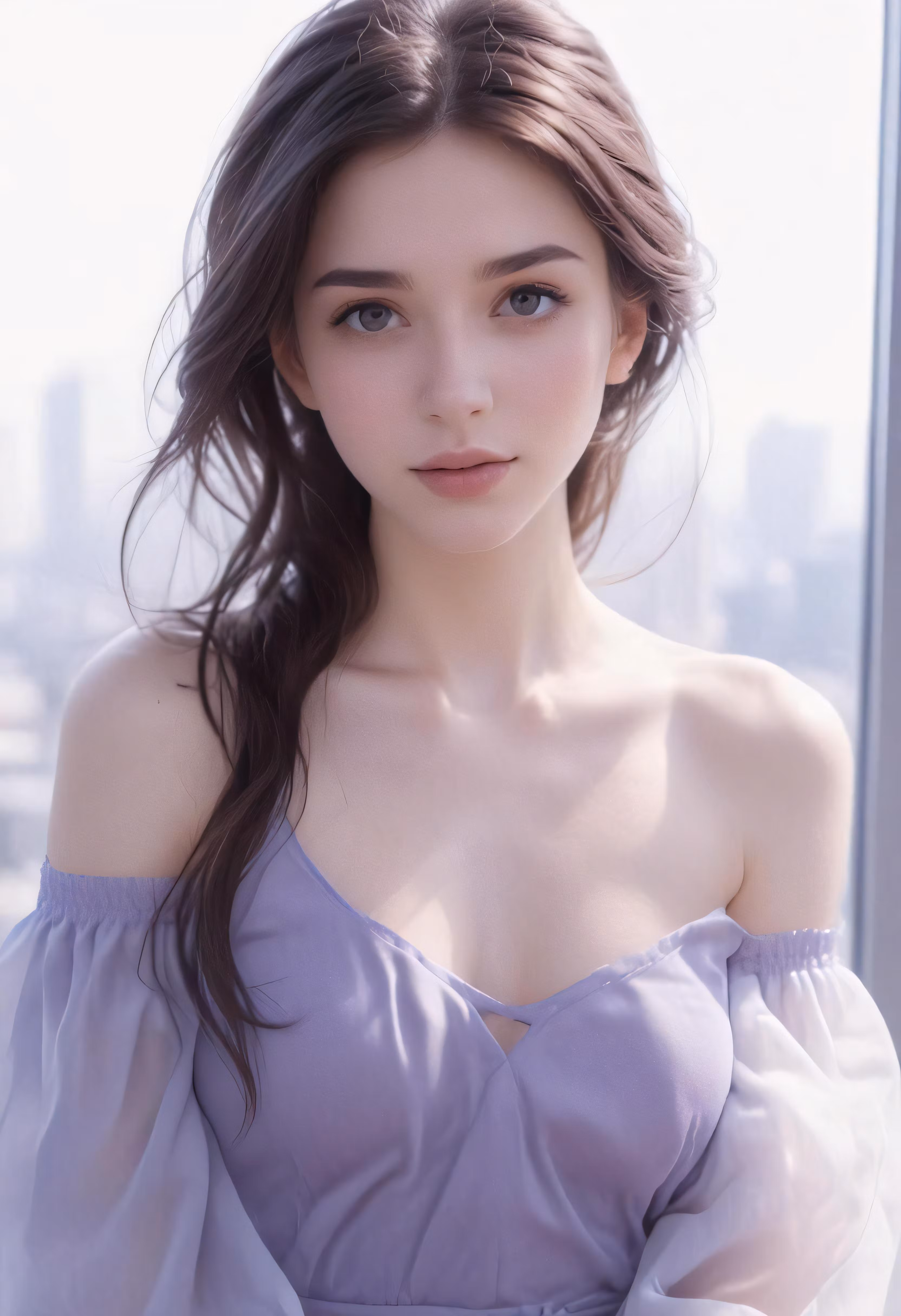 High resolution picture, free to use, an image of a beautiful woman with large breasts posing in front of a window