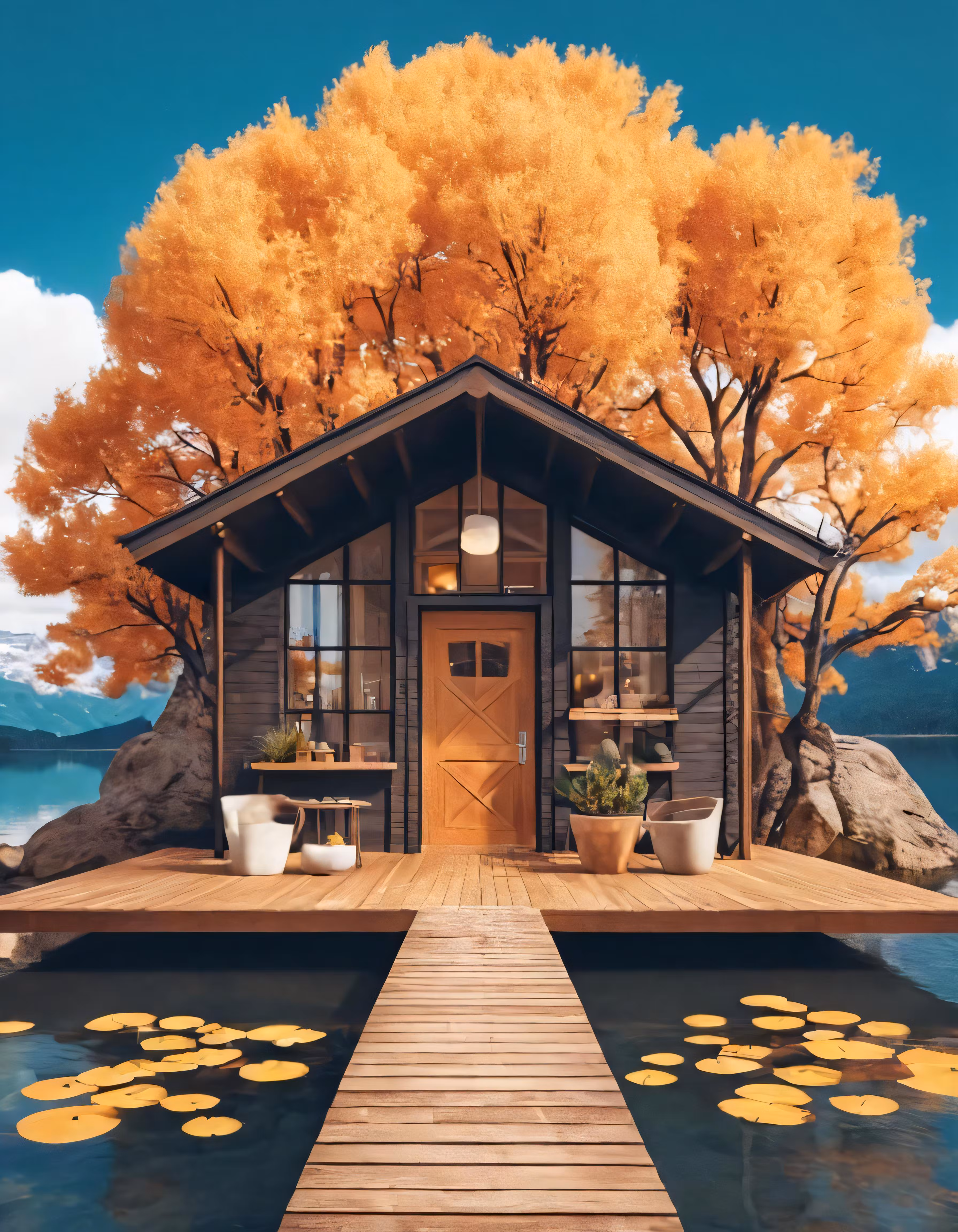 High resolution picture, free to use, an image of a house on a water with fall leaves around it