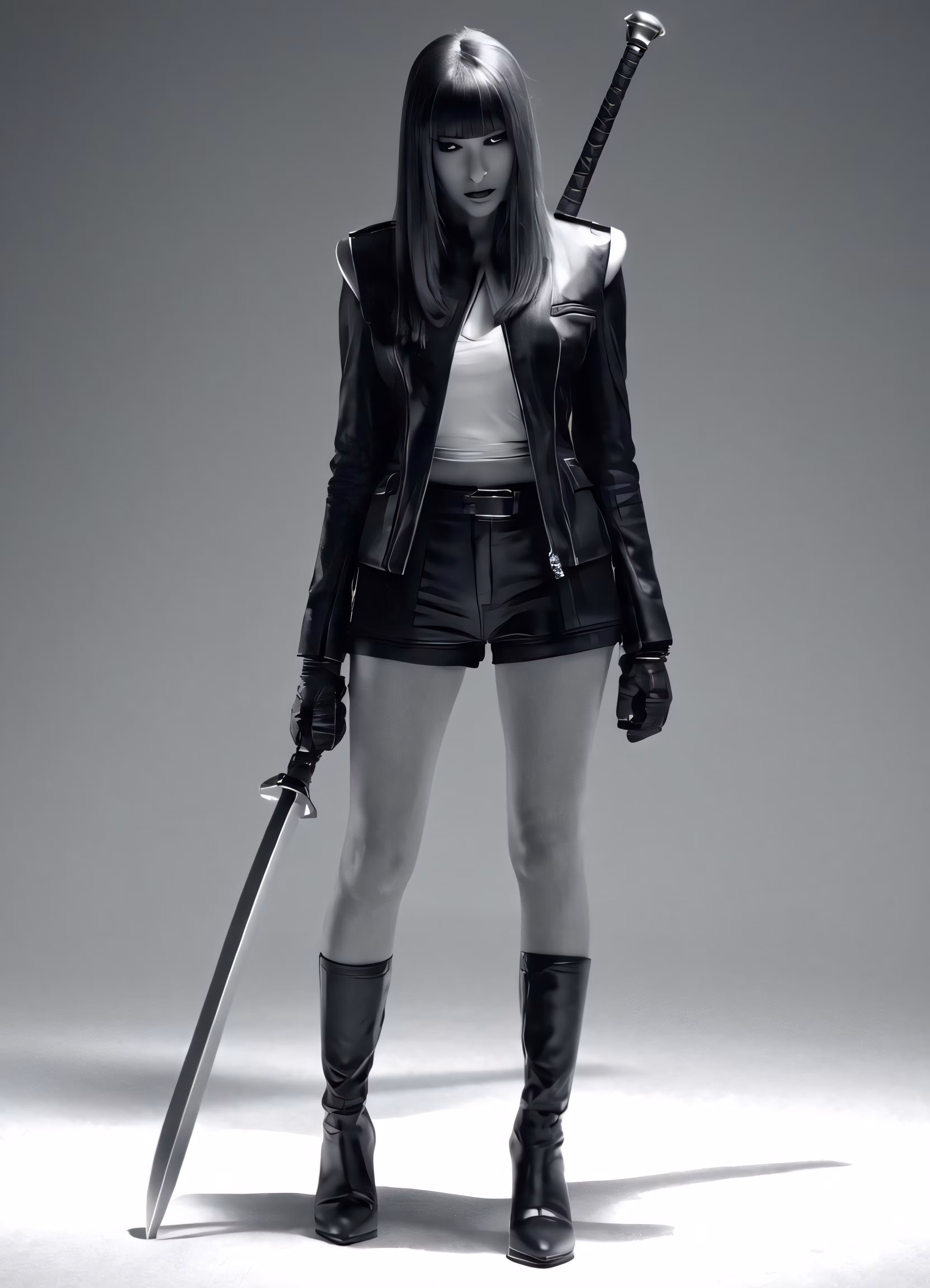 High resolution picture, free to use, an image of a woman in leather holding a sword