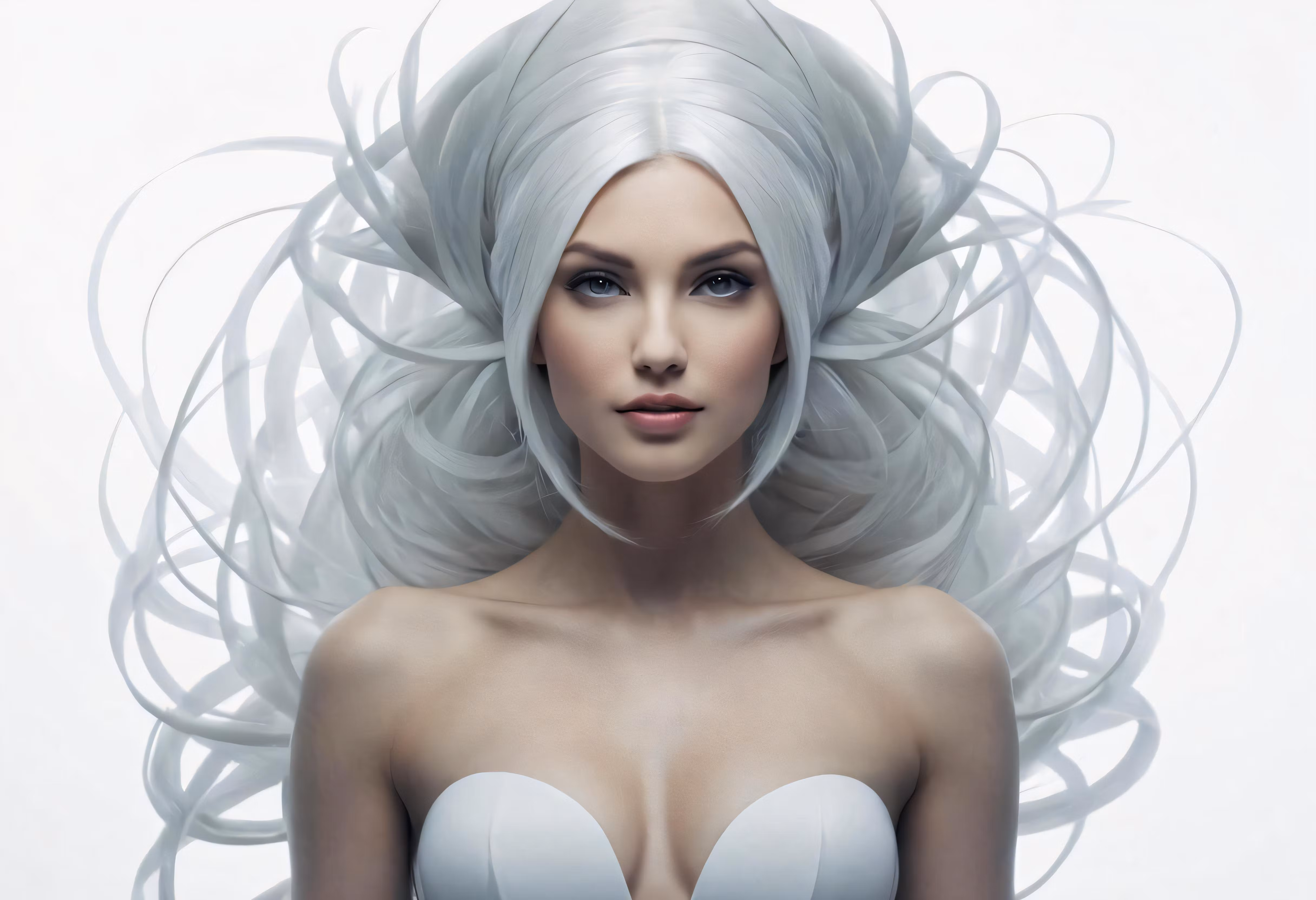 High resolution picture, free to use, an image of a woman with white hair and very unusual hair