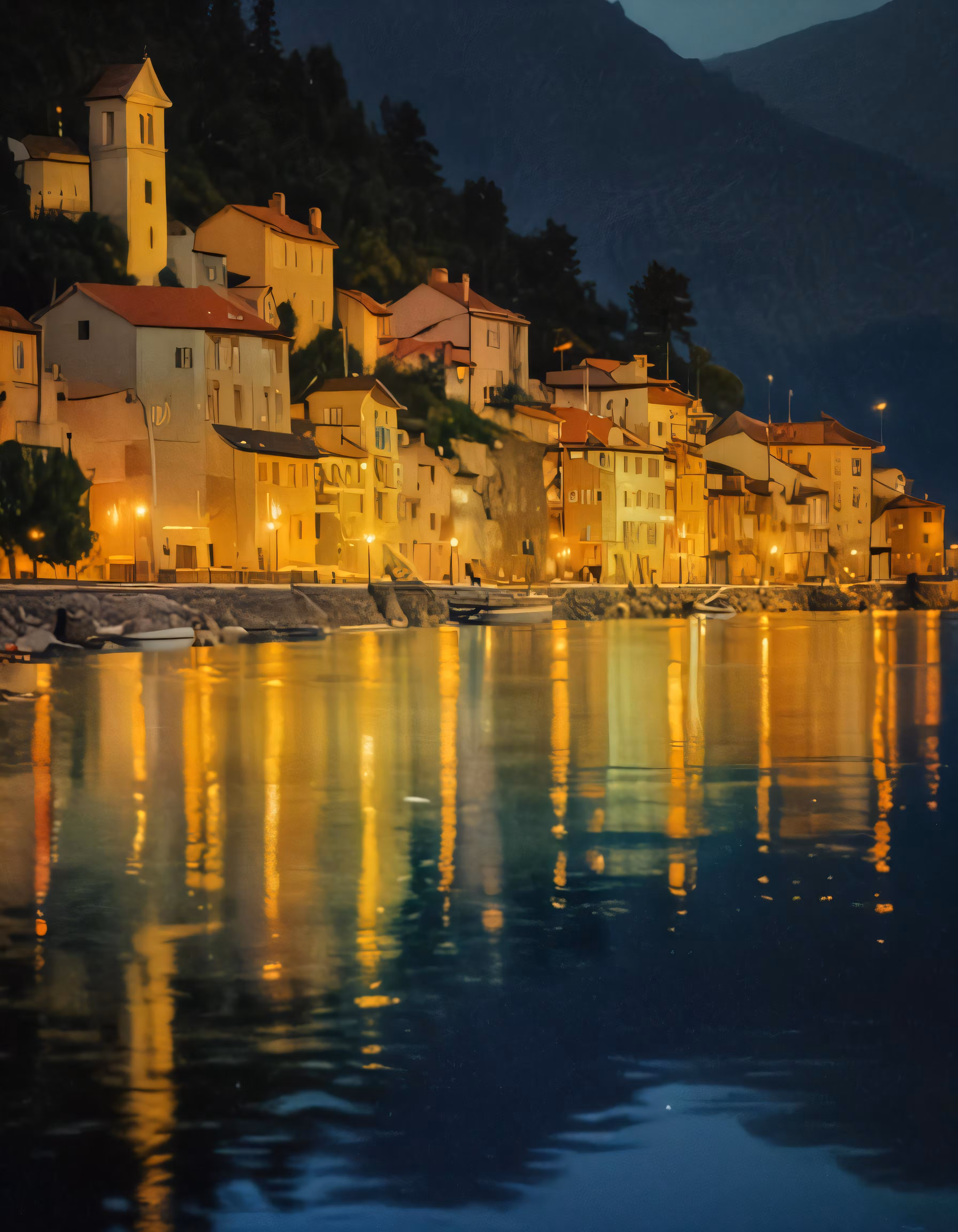 High resolution picture, free to use, an image of town on the coast of the lake at night
