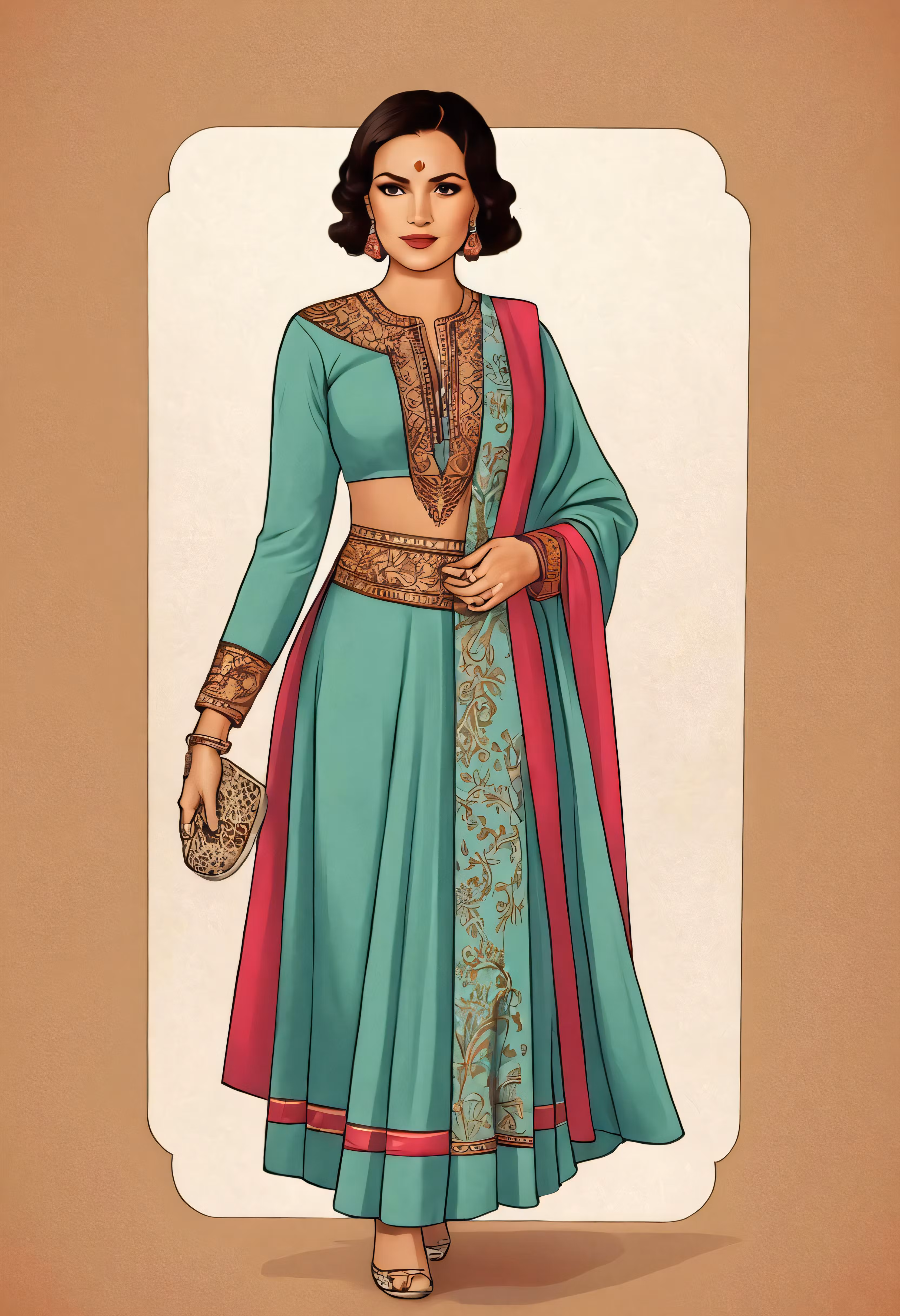 High resolution picture, free to use, an indian woman dressed in blue with a large headpiece and matching red scarf