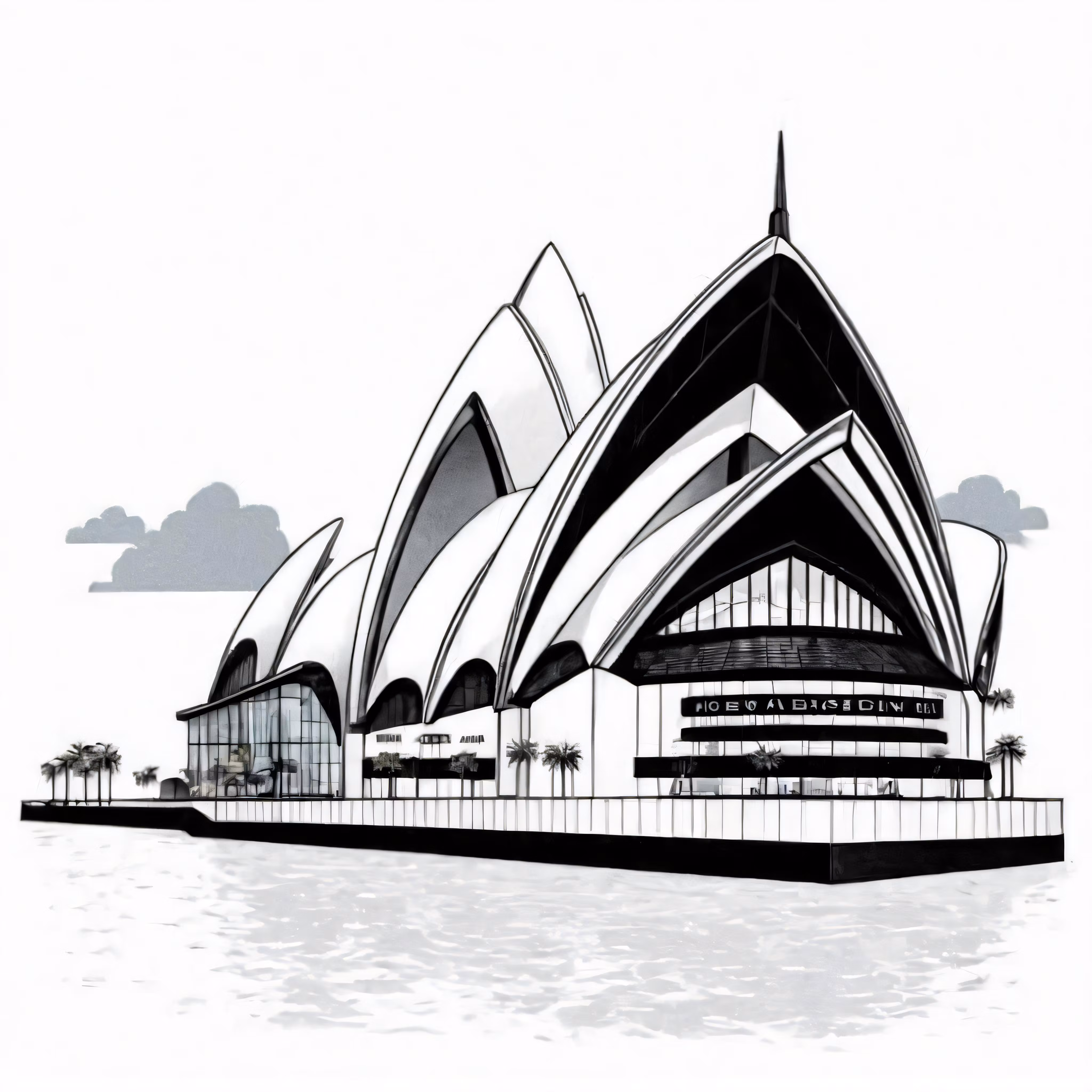 High resolution picture, free to use, an ink drawing of a building on the water