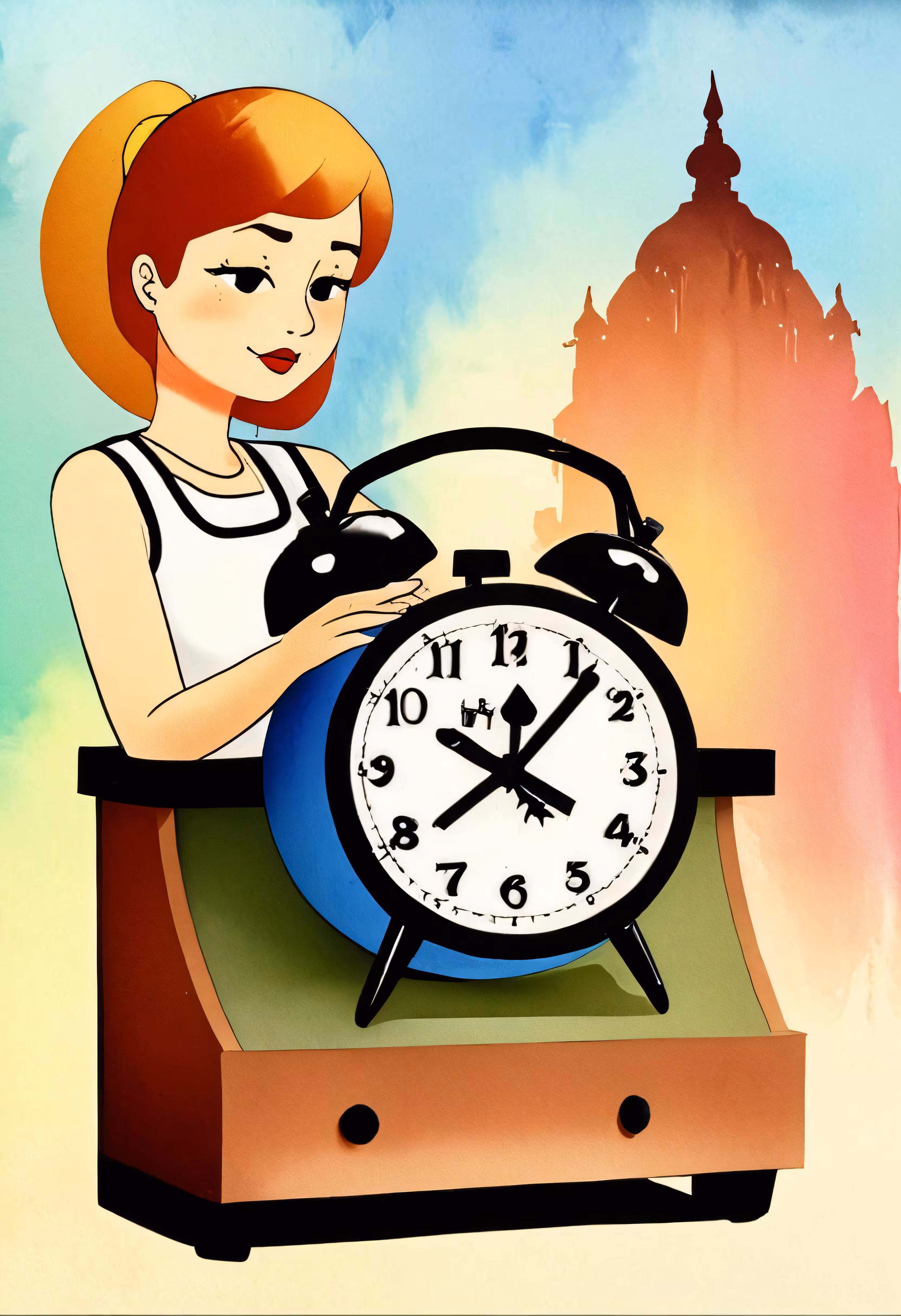 High resolution picture, free to use, an old   fashioned poster featuring a woman putting a clock on the hour