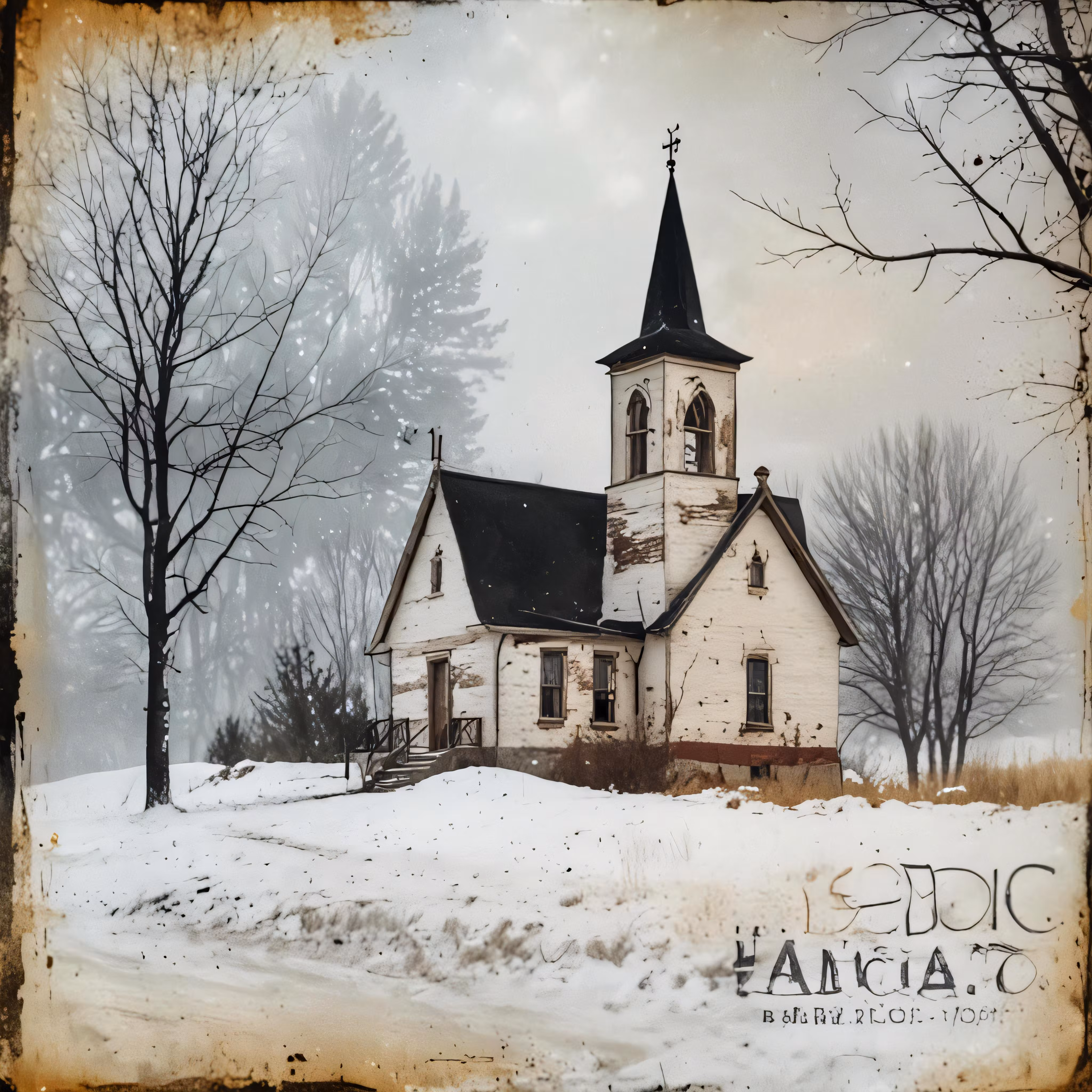 High resolution picture, free to use, an old church with snow on the ground and trees