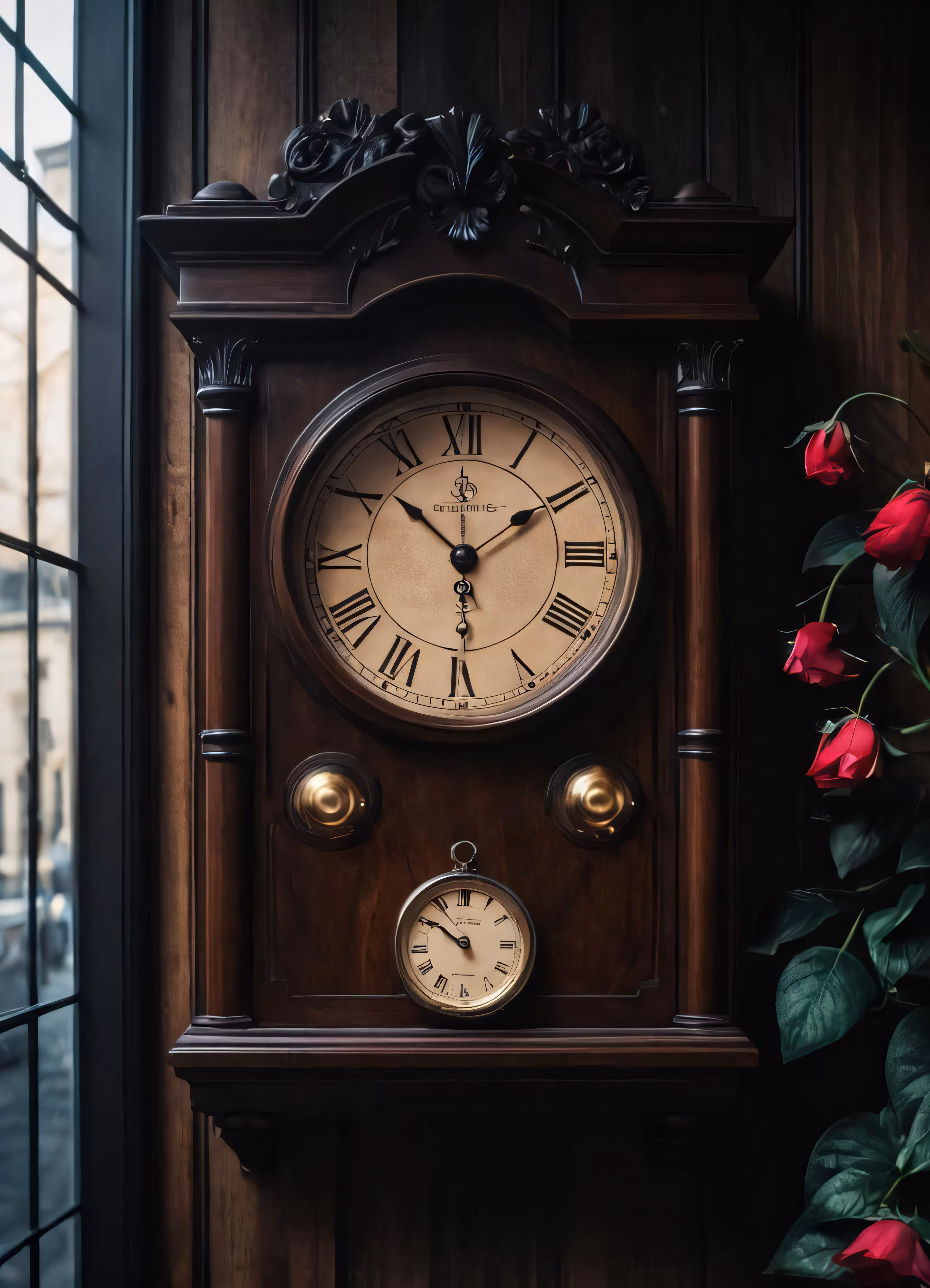 High resolution picture, free to use, an old clock is surrounded by red flowers