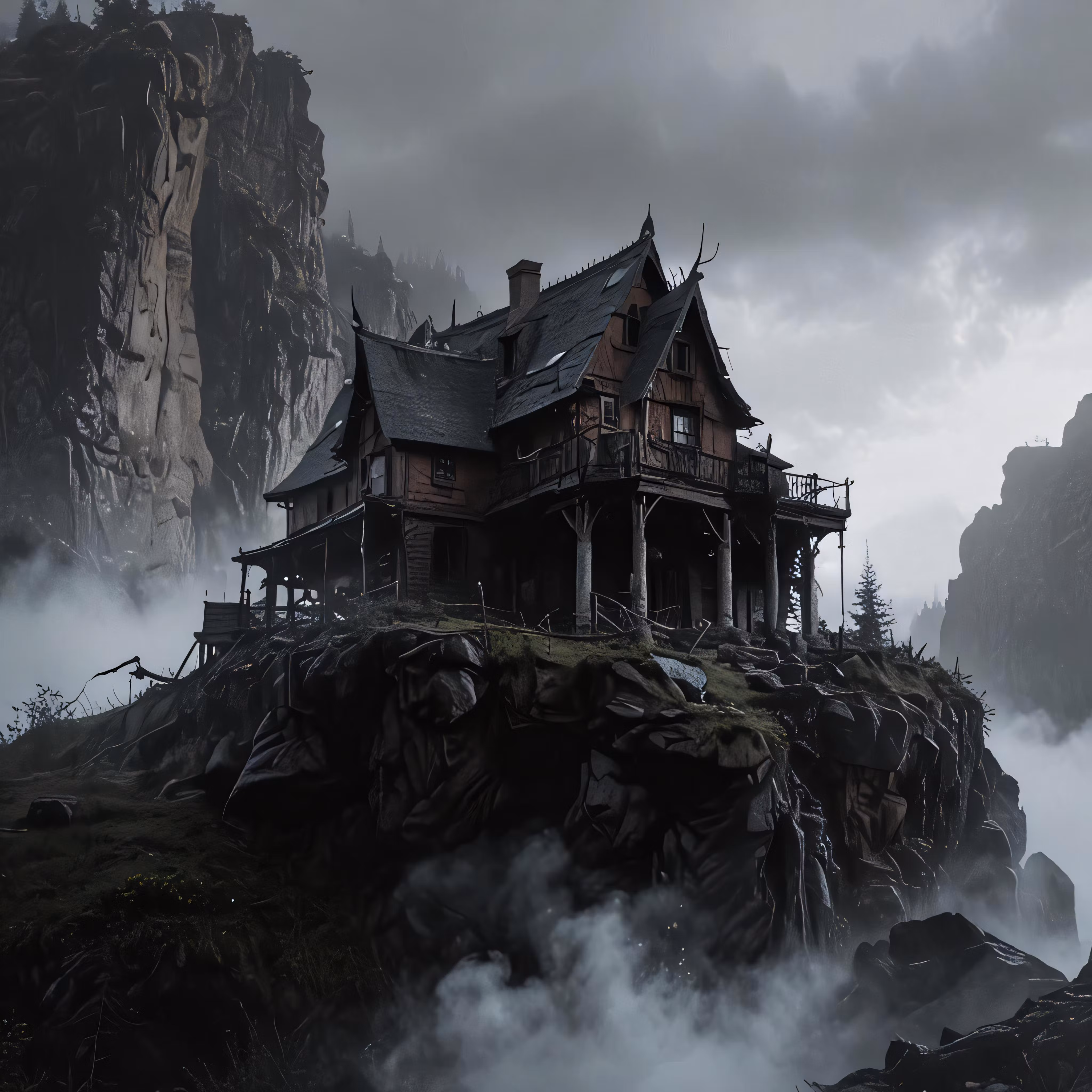 High resolution picture, free to use, an old house with mist coming out of the ground