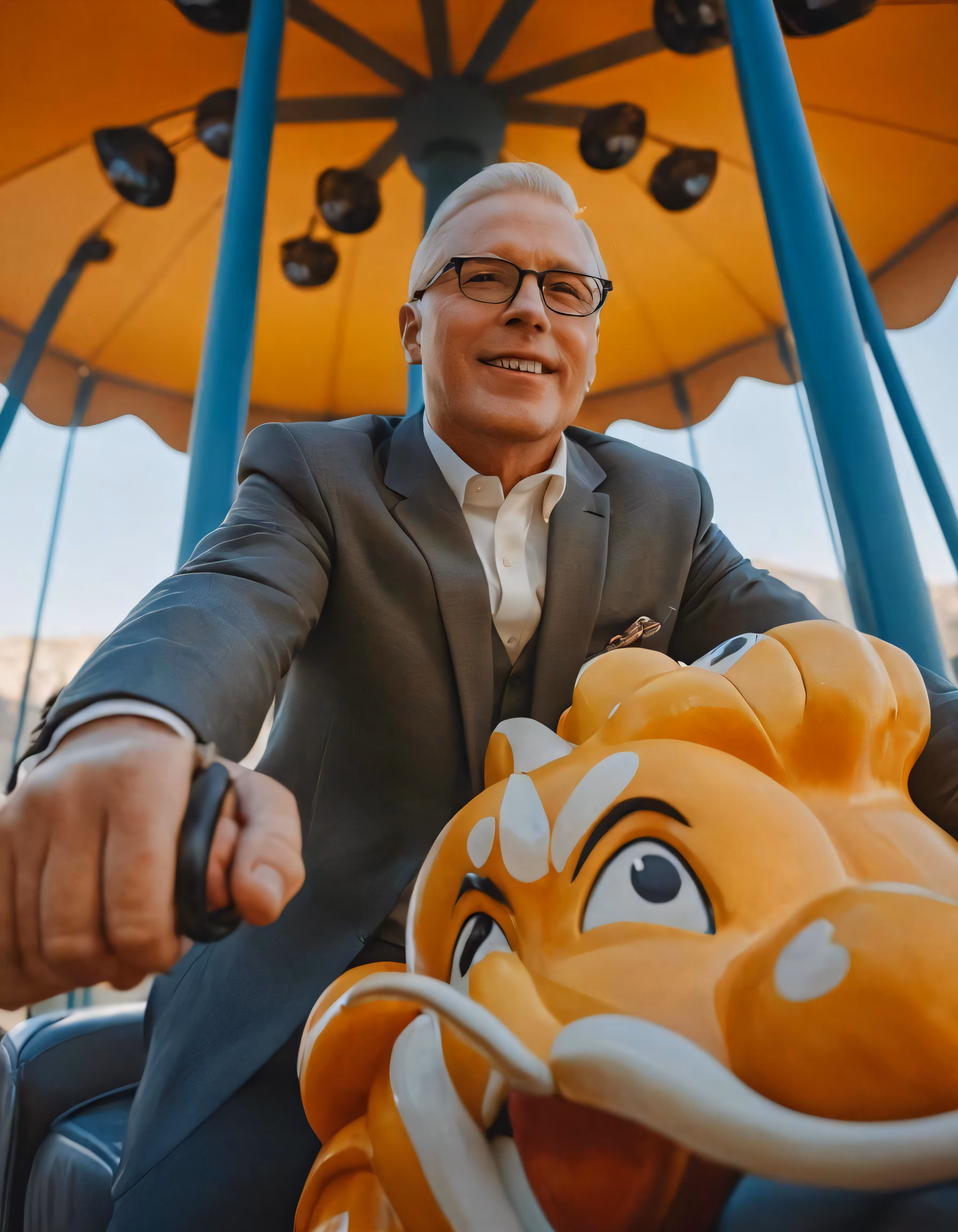 High resolution picture, free to use, an older man in suit rides the ride at an amusement park