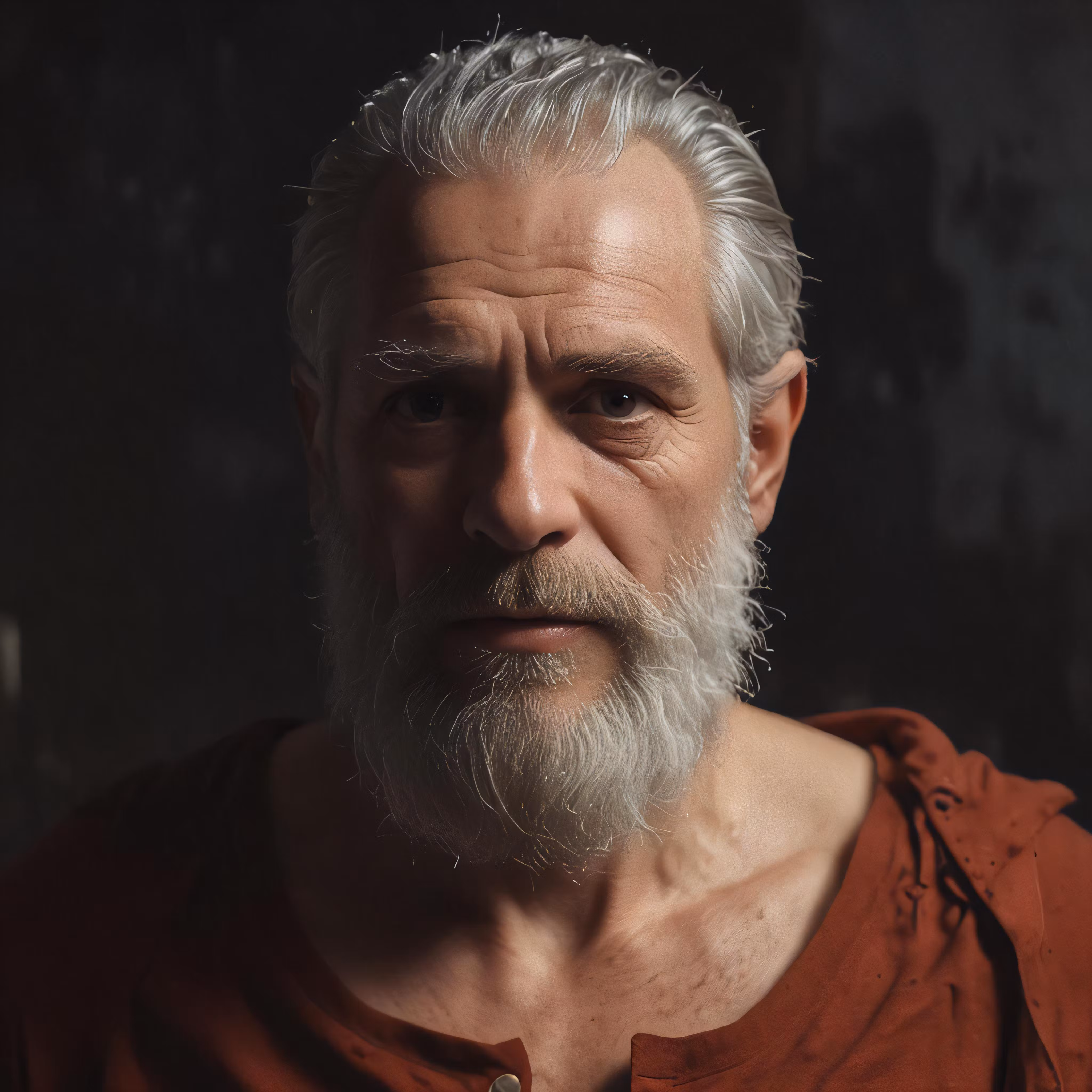 High resolution picture, free to use, an older man with white hair and a goatee beard looks menacing