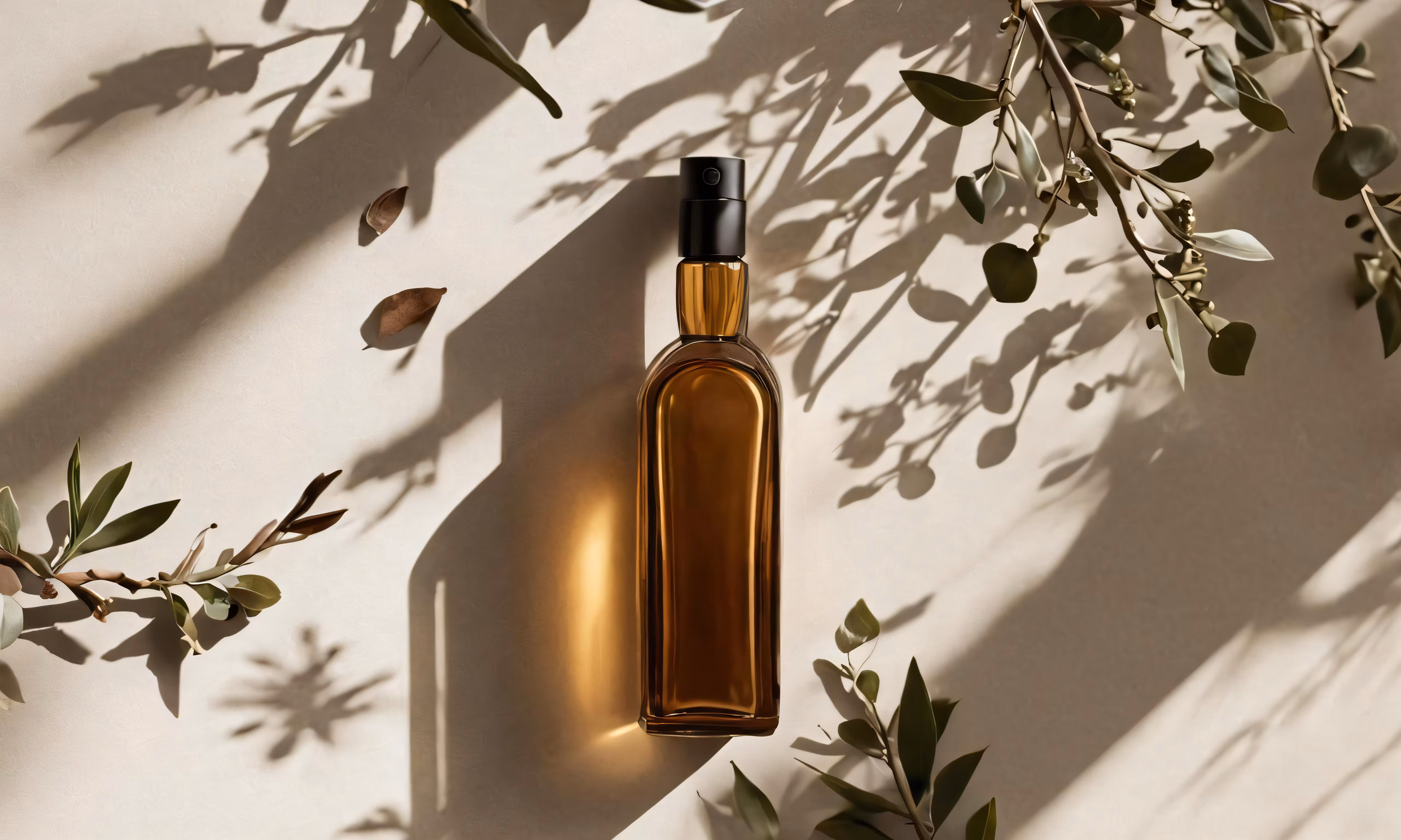 High resolution picture, free to use, an olive oil bottle surrounded by small leaves