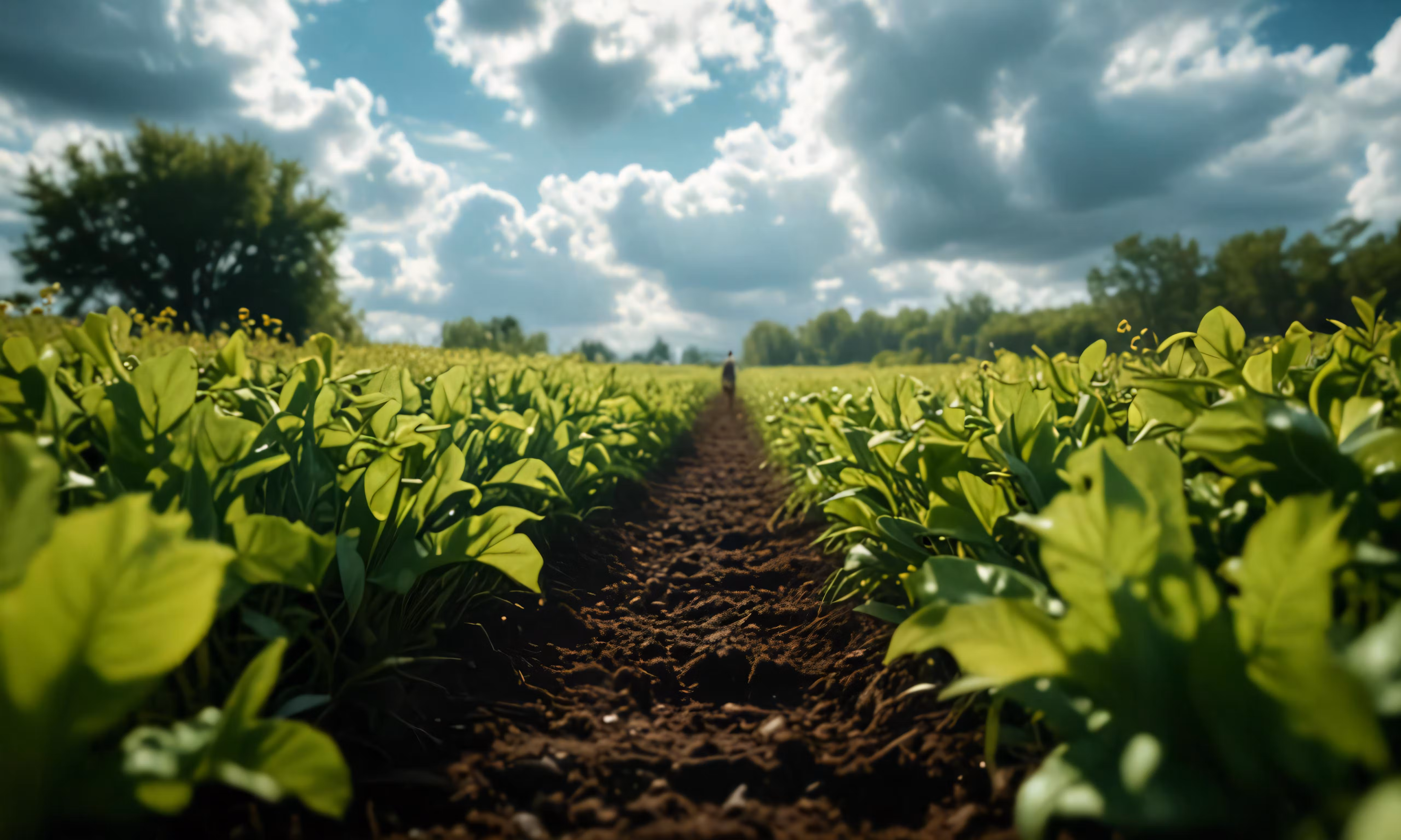 High resolution picture, free to use, an open field with a leafy green plant growing in the foreground and a tree with two branches in the distance