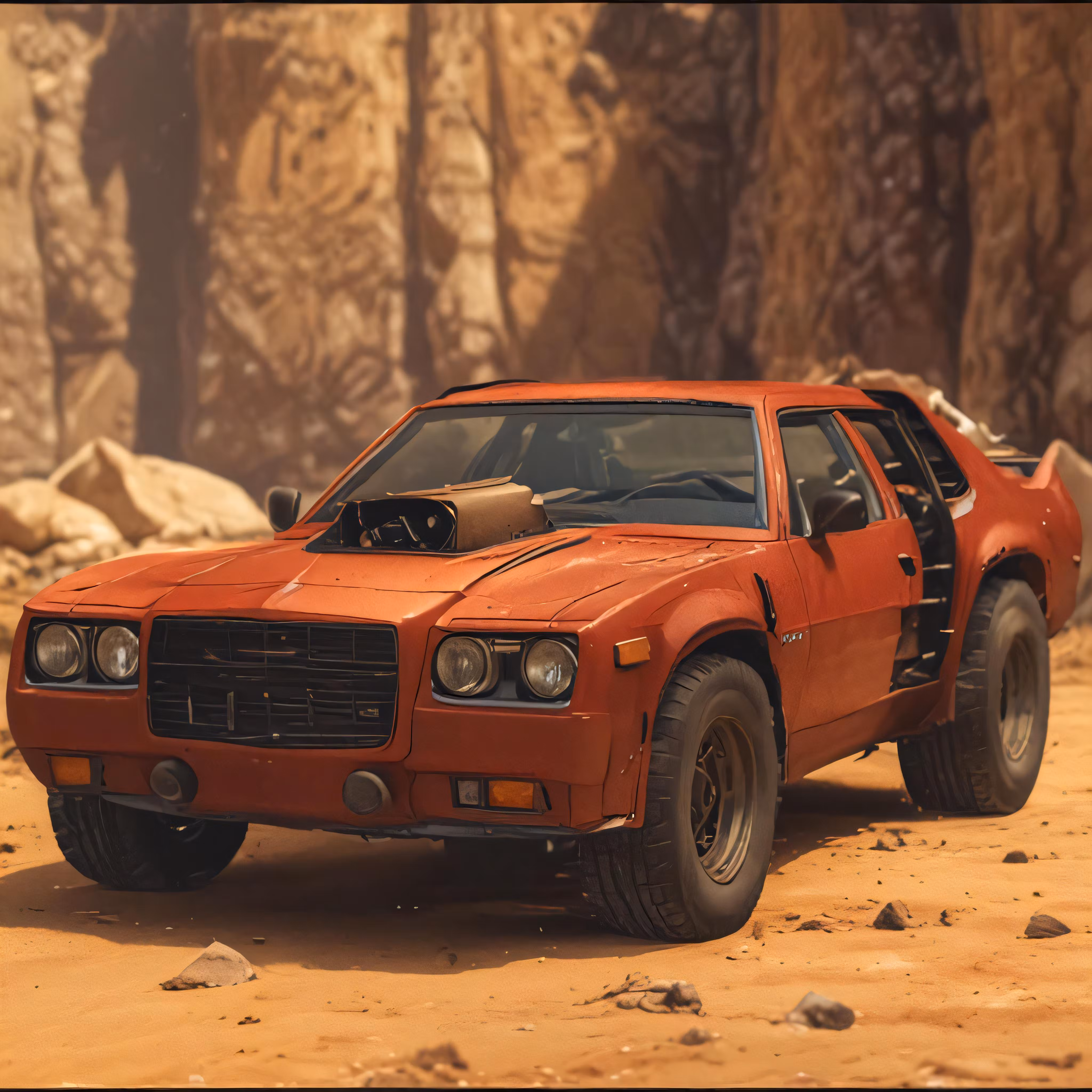 High resolution picture, free to use, an orange and grey delapidable vehicle is in a desert