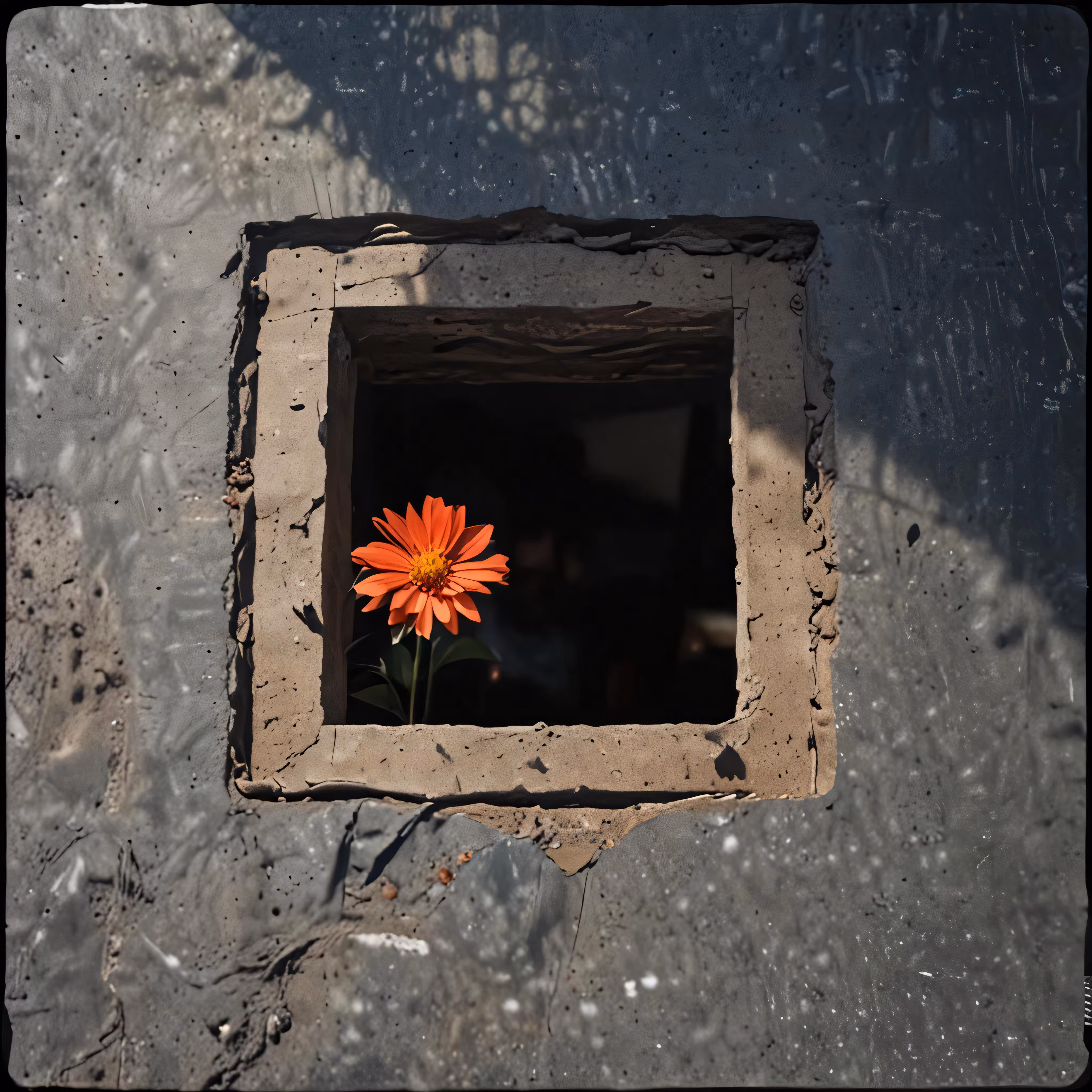 High resolution picture, free to use, an orange flower sitting in a small window