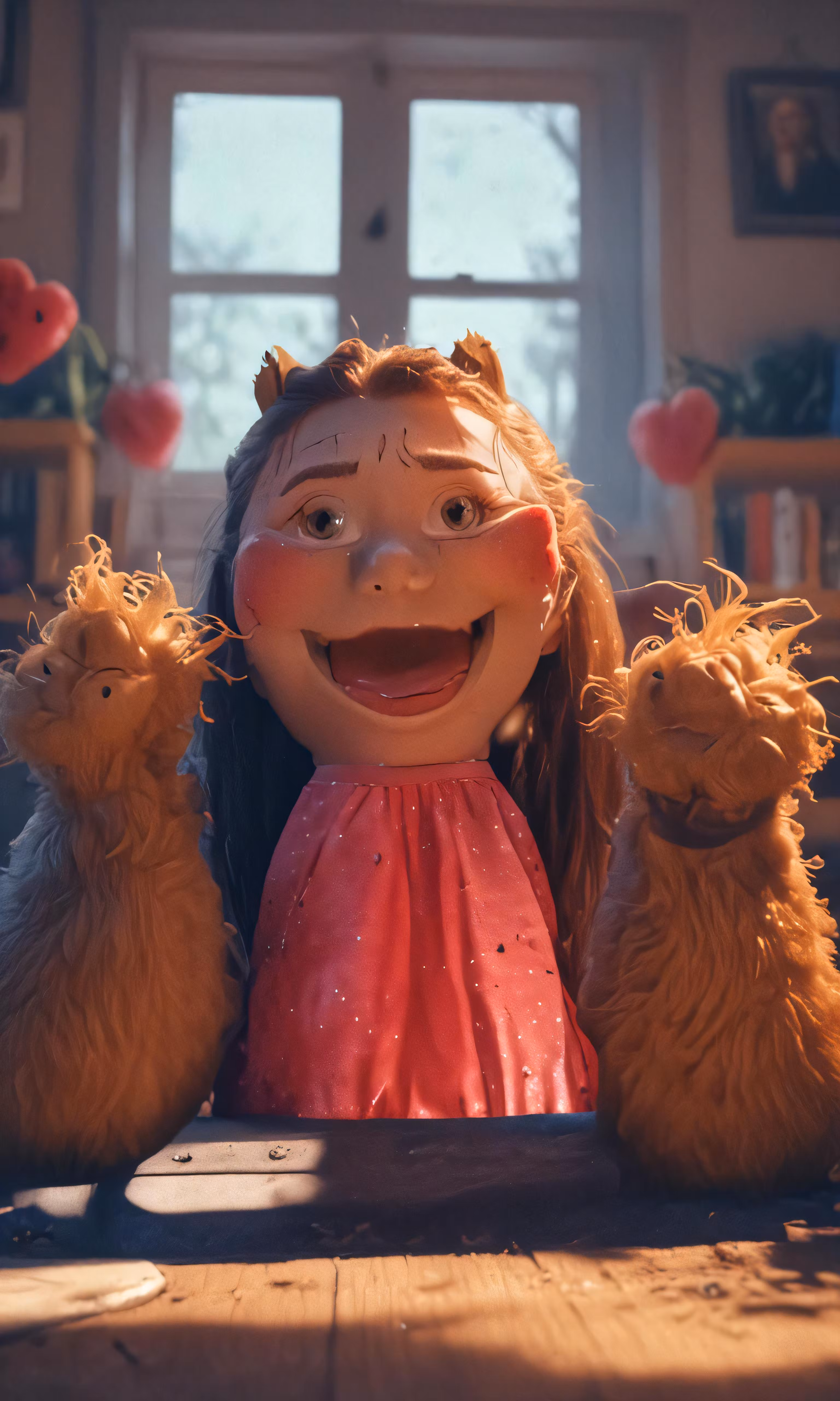 High resolution picture, free to use, an orange haired doll sitting between two bears
