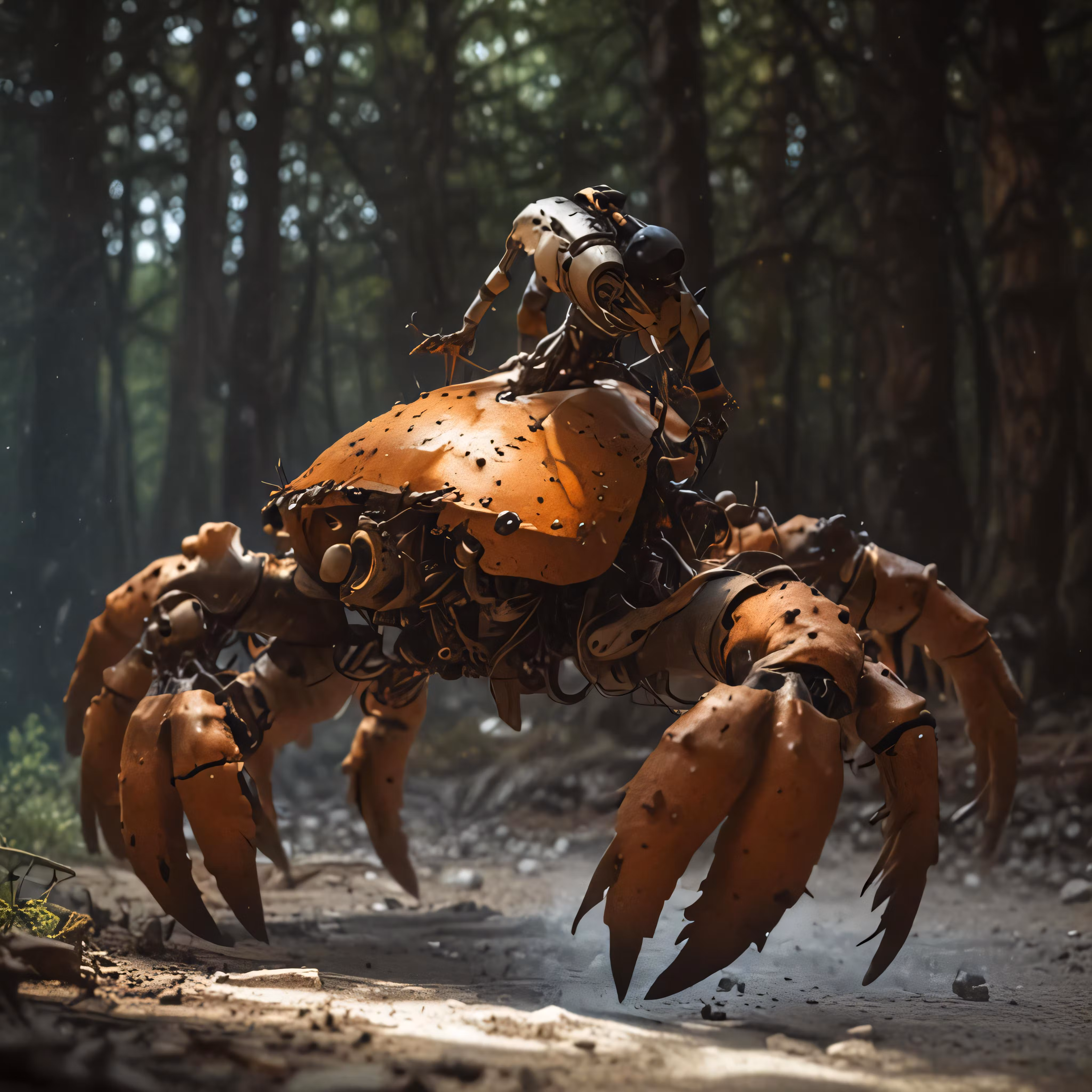 High resolution picture, free to use, an orange robotic crab with multiple claws in the middle of a forest