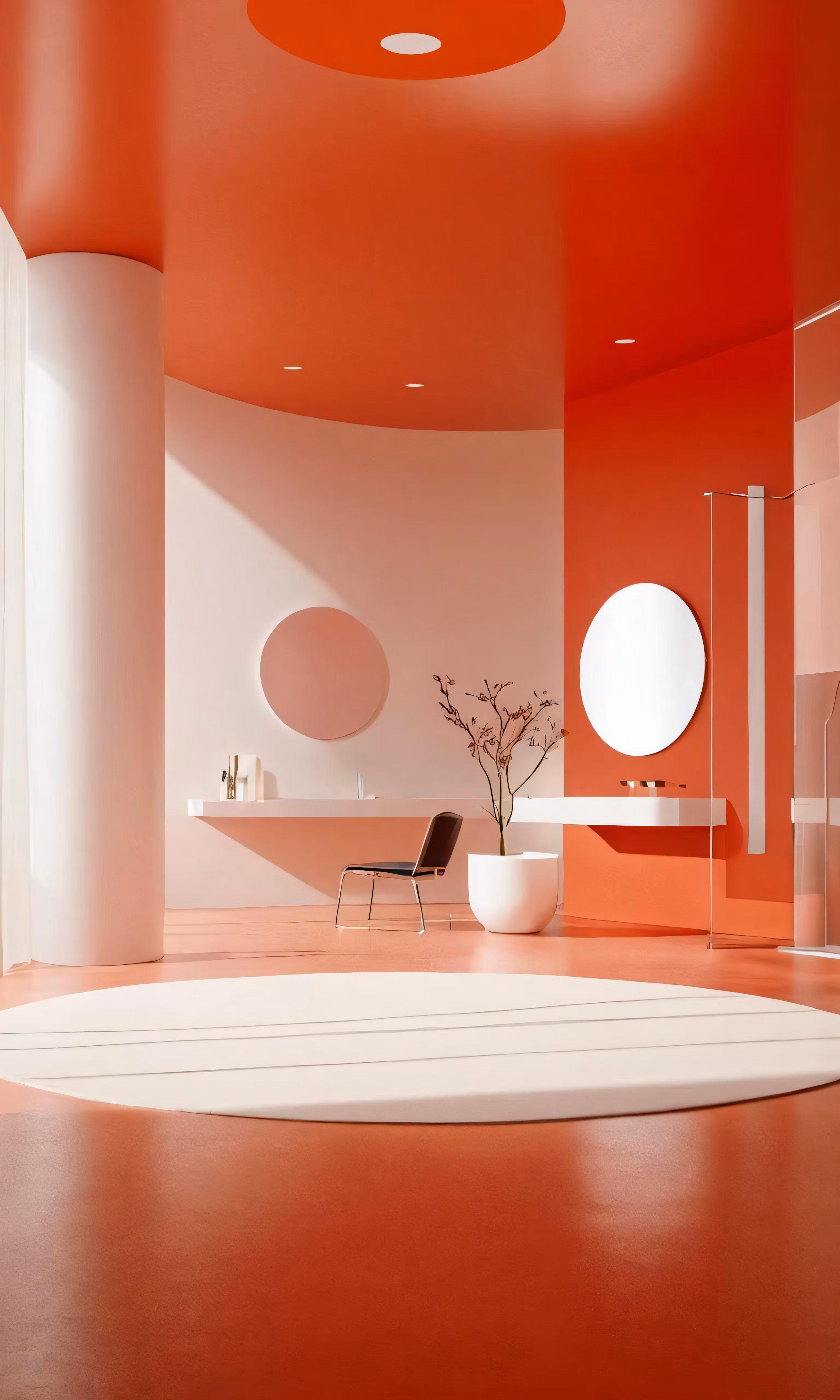 High resolution picture, free to use, an orange room with red flooring and circular mirrors