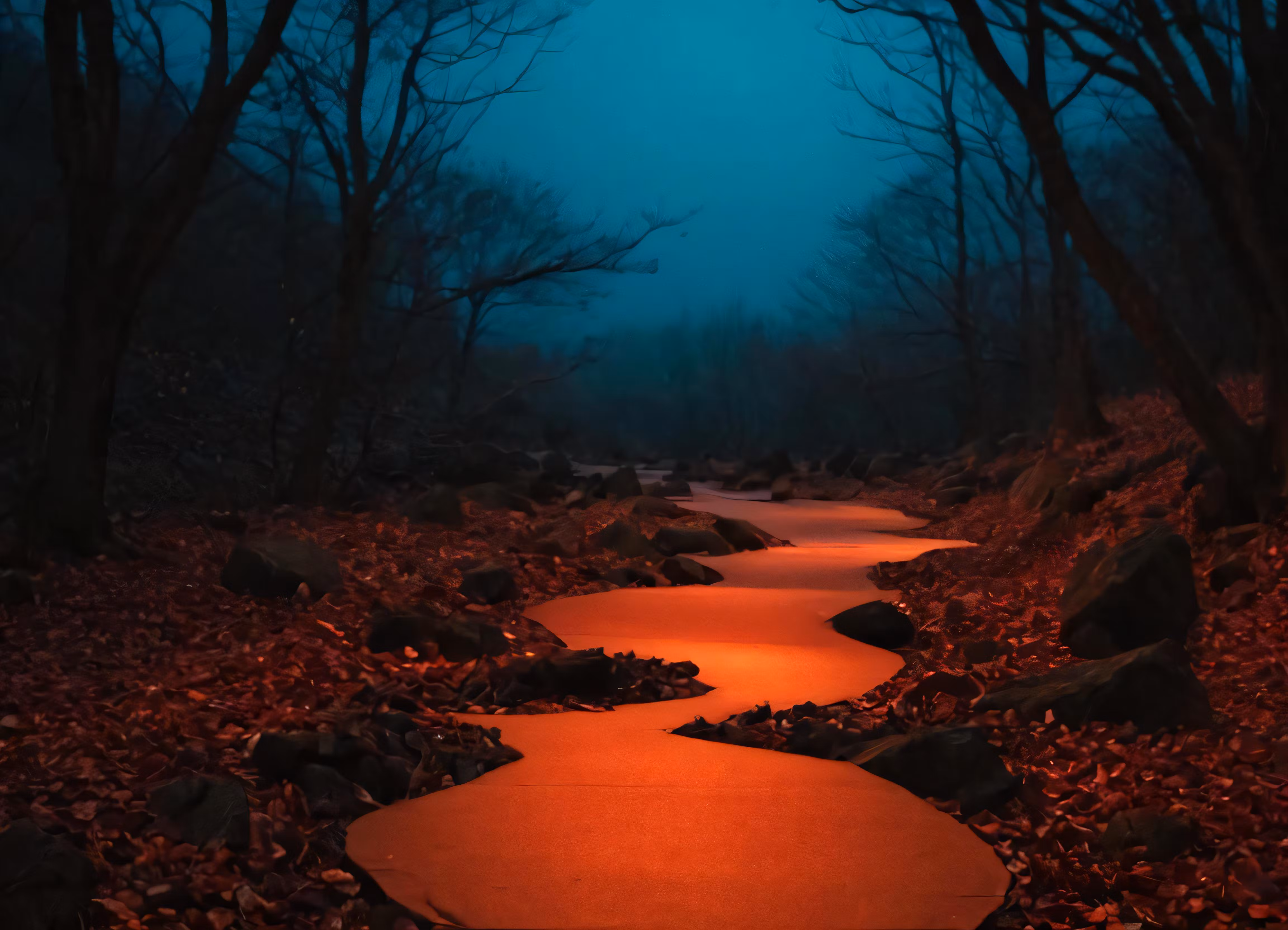 High resolution picture, free to use, an orange sidewalk in the middle of a wooded area at night
