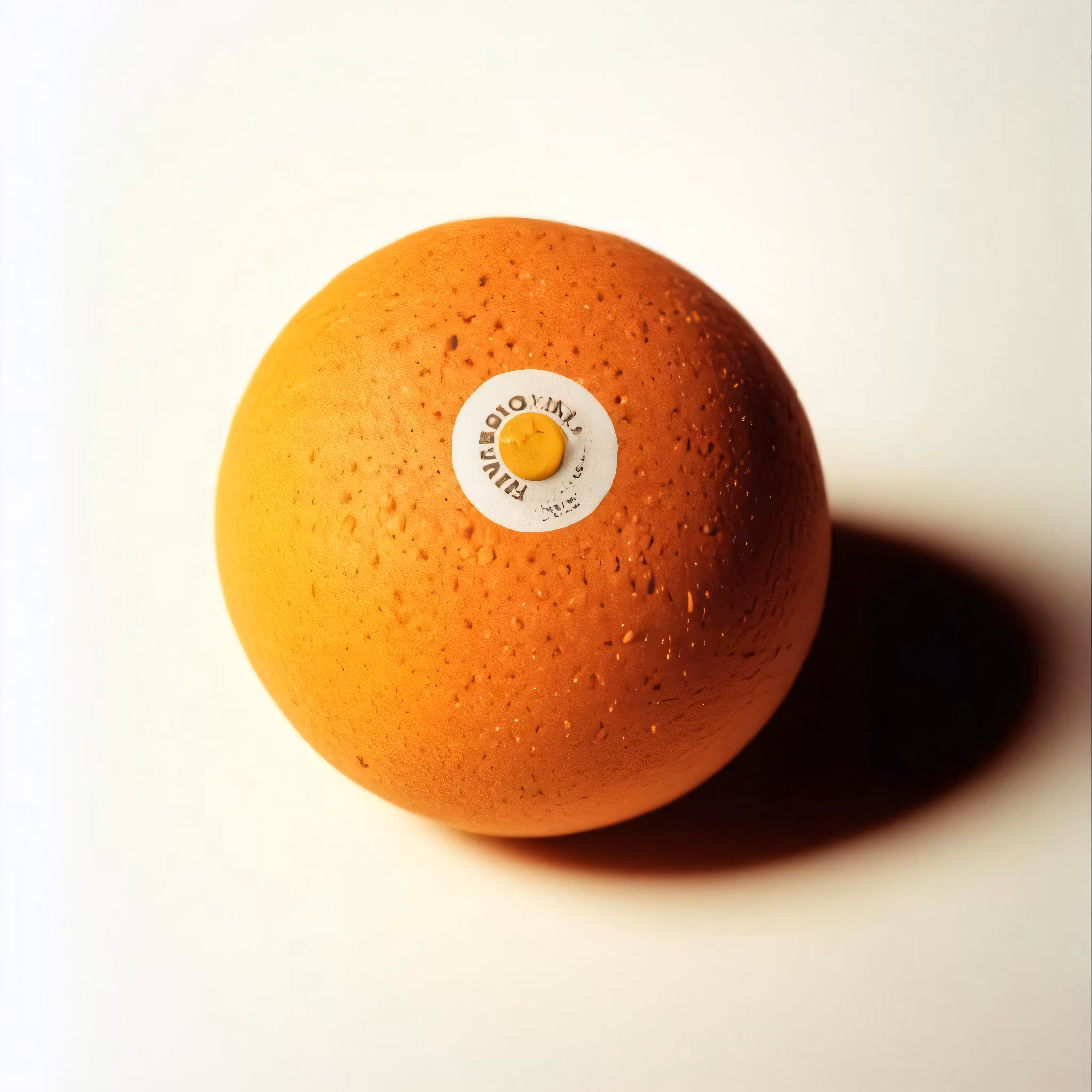 High resolution picture, free to use, an orange with a button is shown sitting on the table