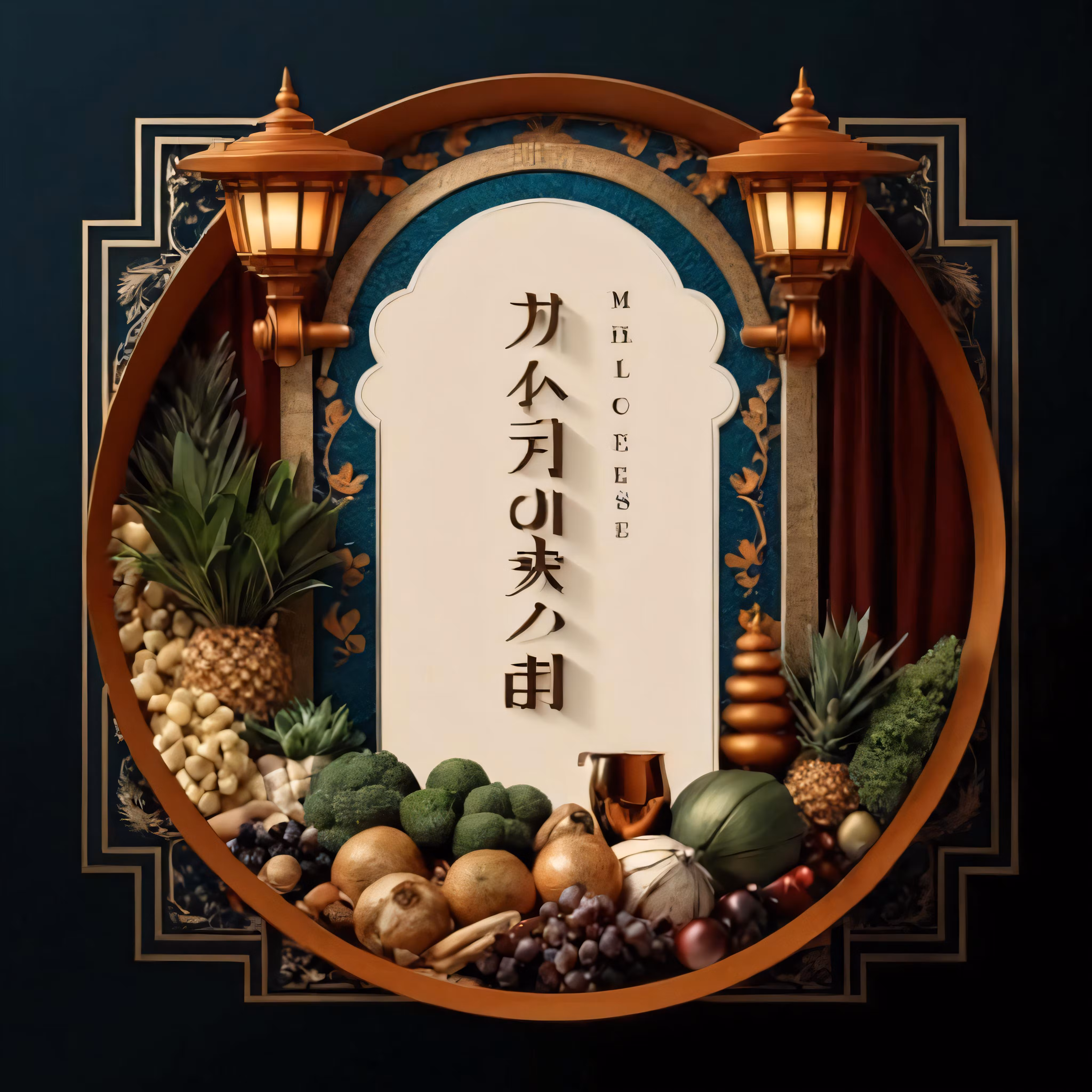 High resolution picture, free to use, an oriental sign with a lot of fruits and vegetables
