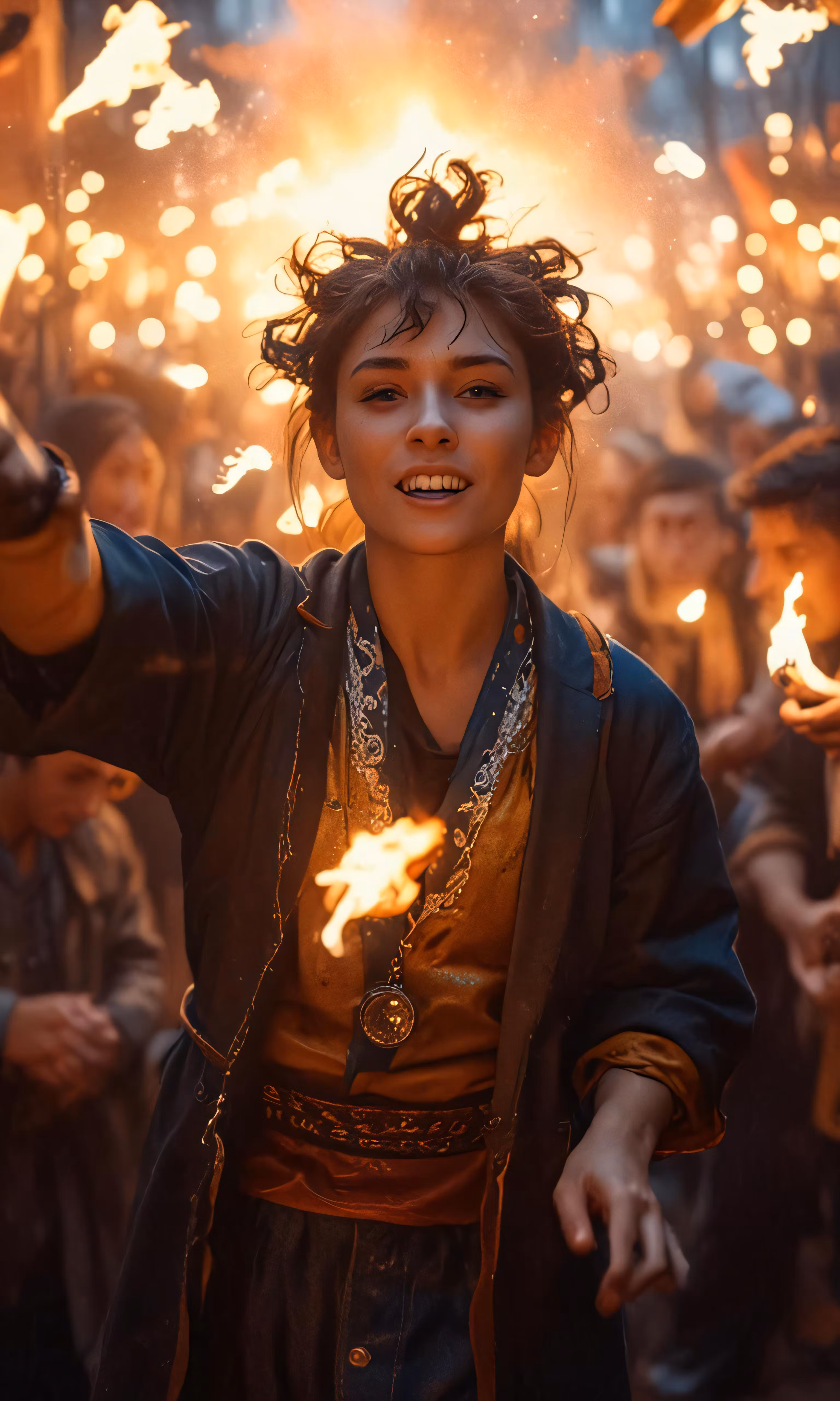 High resolution picture, free to use, an oriental woman with dark hair and light up hair holding torches