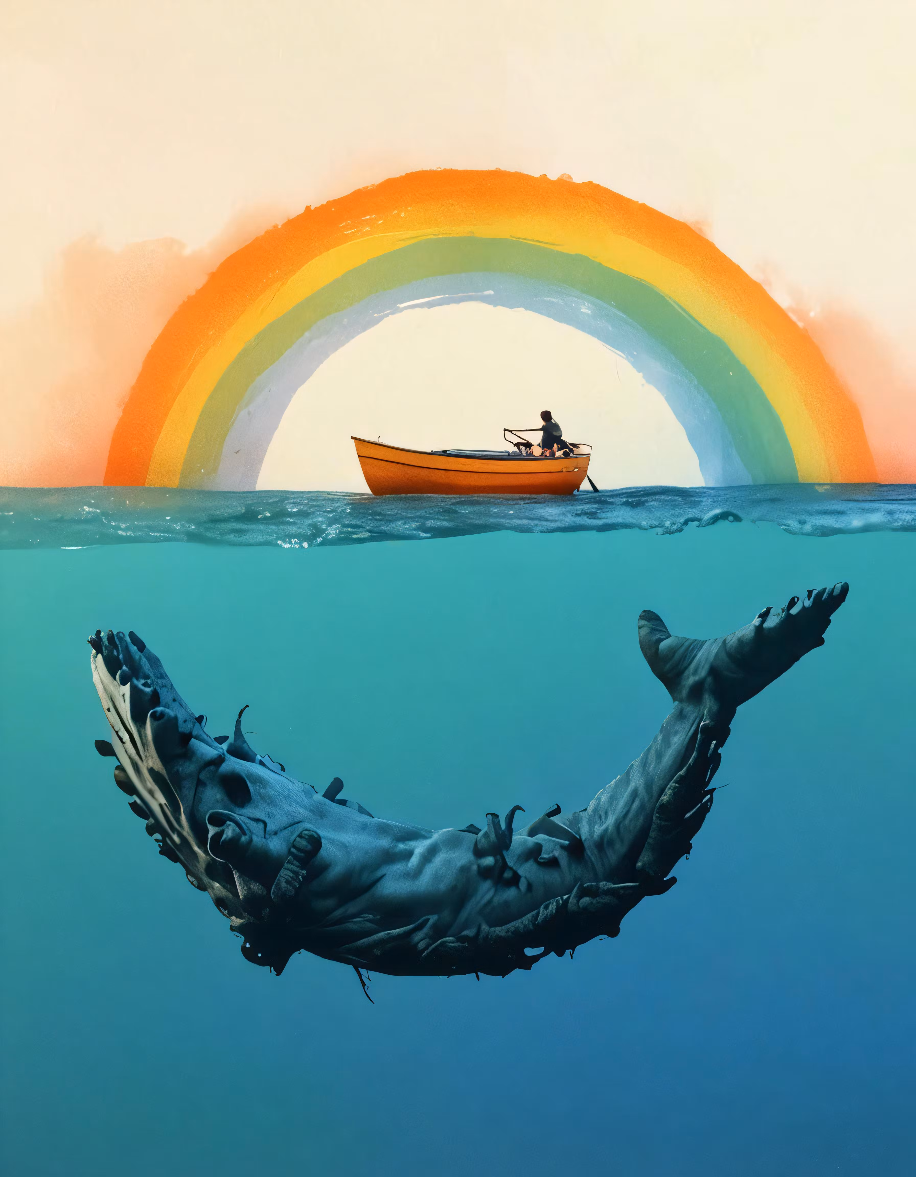 High resolution picture, free to use, an underwater photograph of a person in a boat at sea with a rainbow above