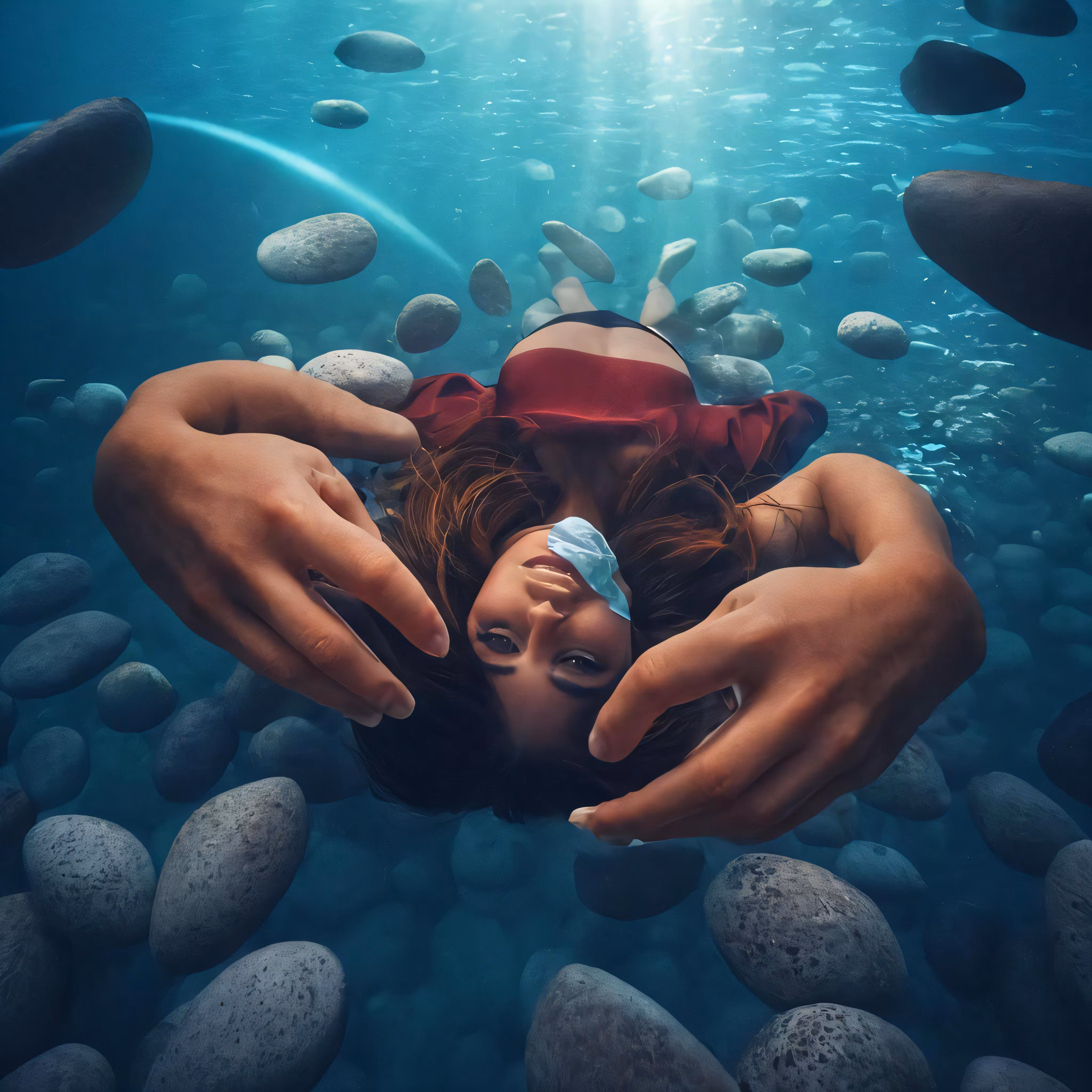 High resolution picture, free to use, an underwater portrait shows two people swimming and one has her head under her hands