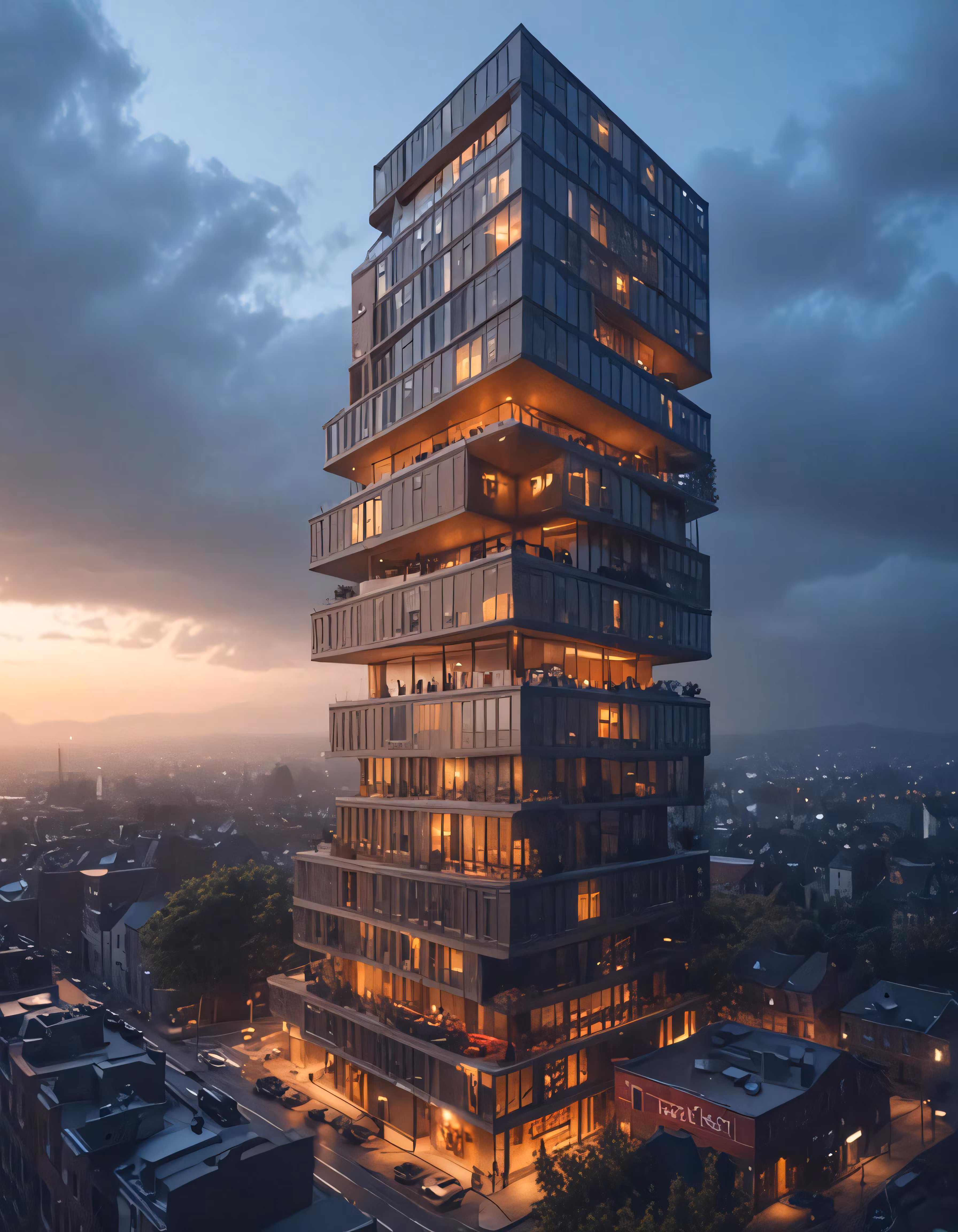 High resolution picture, free to use, an unusual building is illuminated at night near a large city