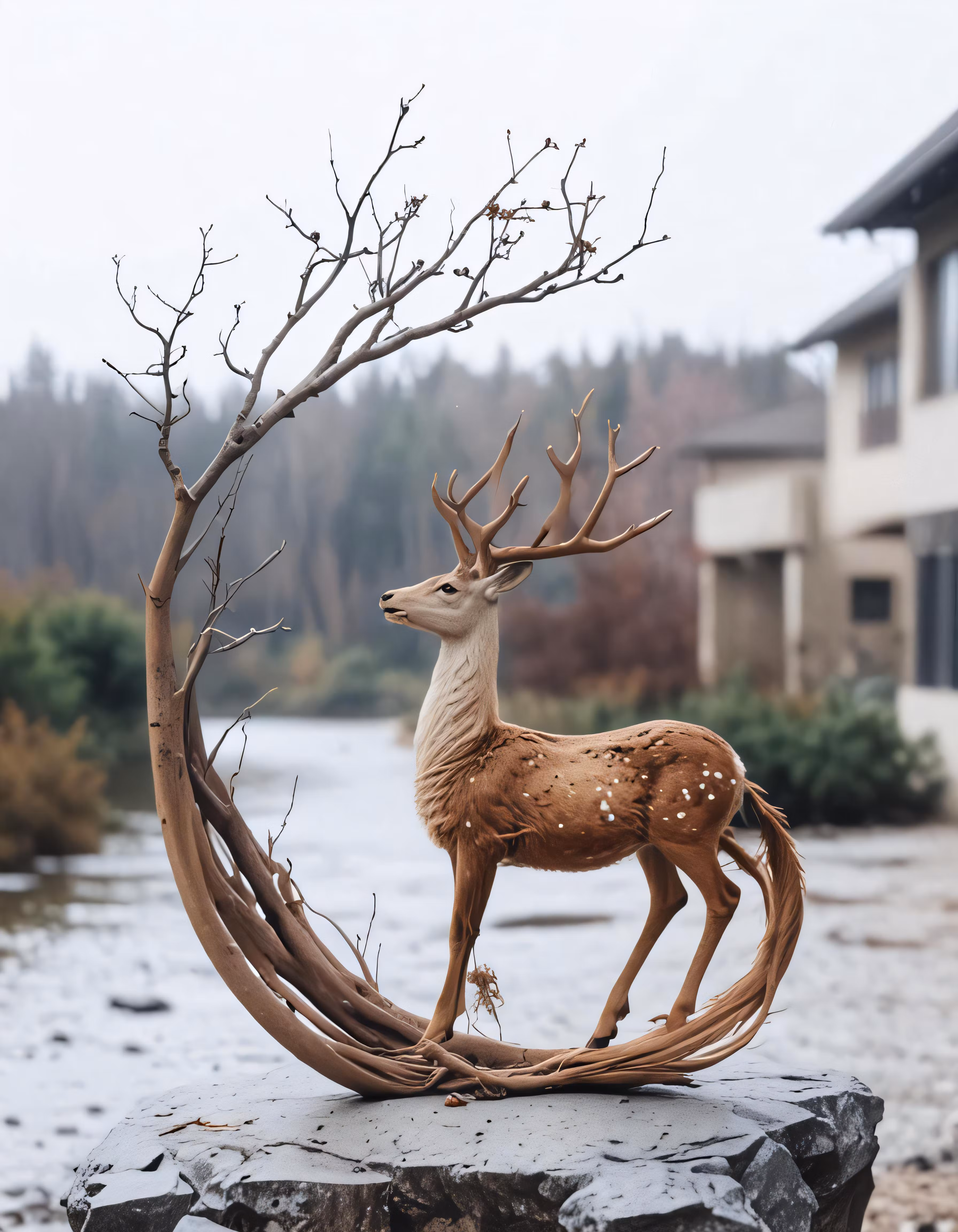 High resolution picture, free to use, an unusual sculpture of a deer near a building