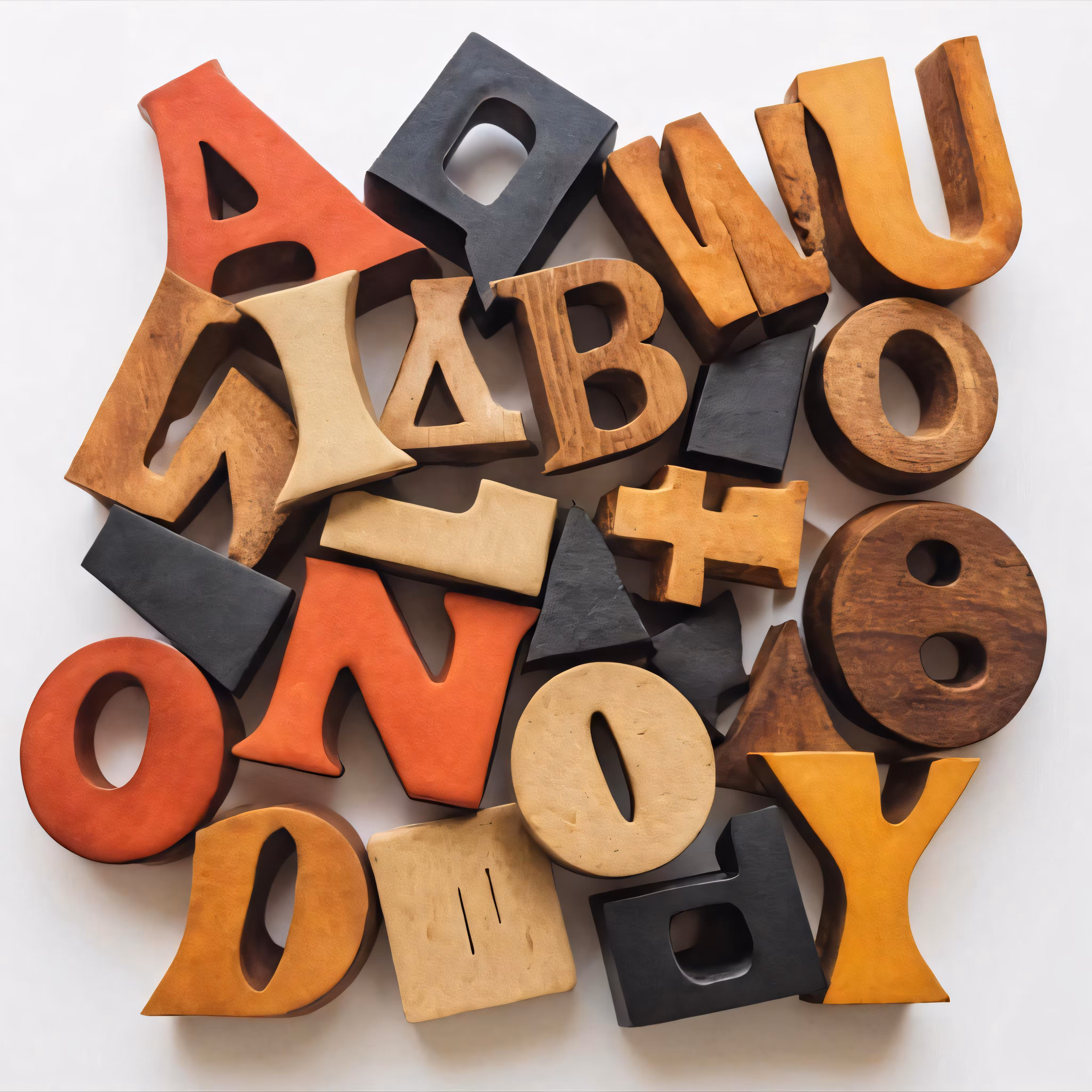 High resolution picture, free to use, assorted wooden and letter shapes laid out in a pile