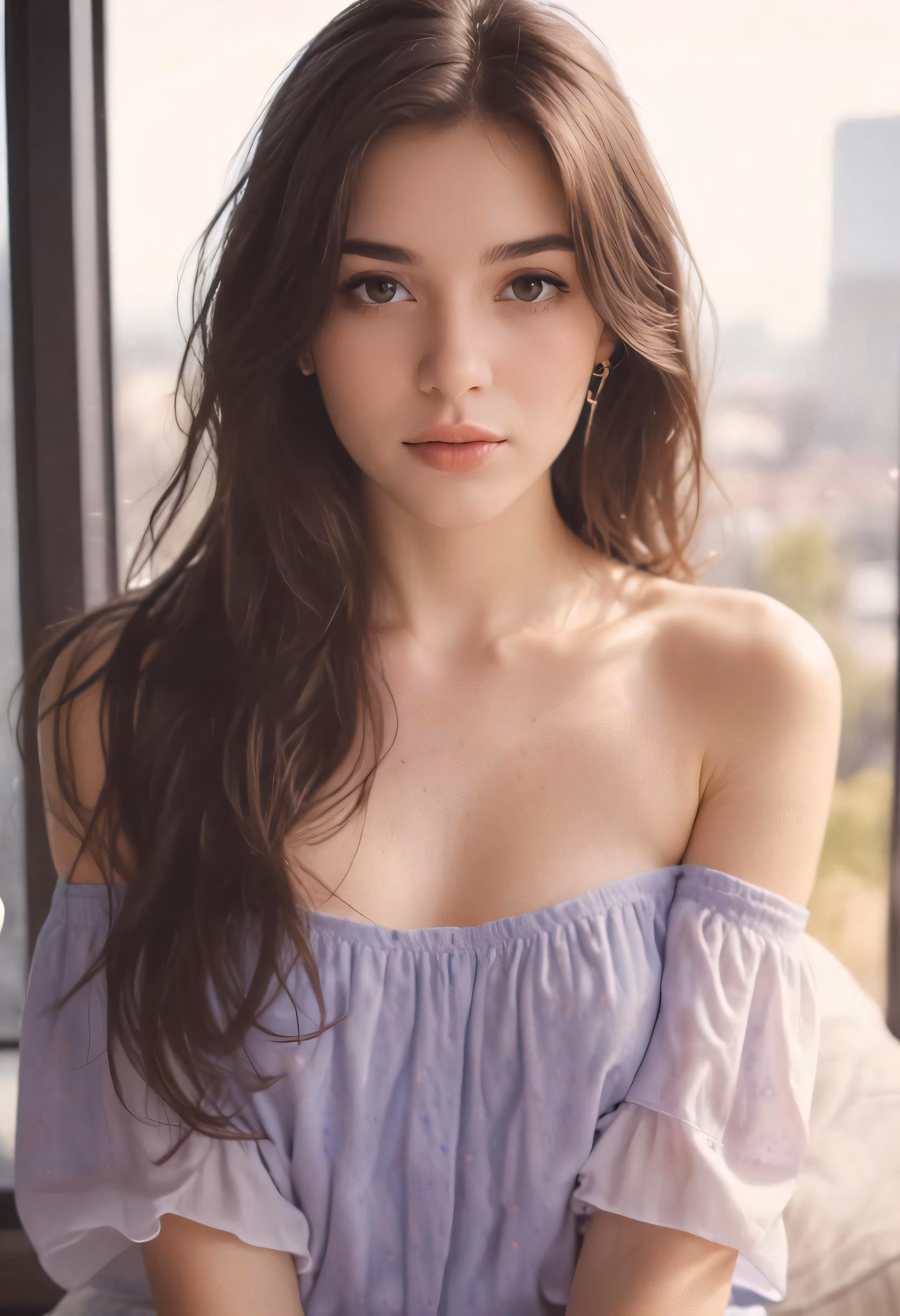 High resolution picture, free to use, beautiful young woman in purple shirt leaning on window ledge
