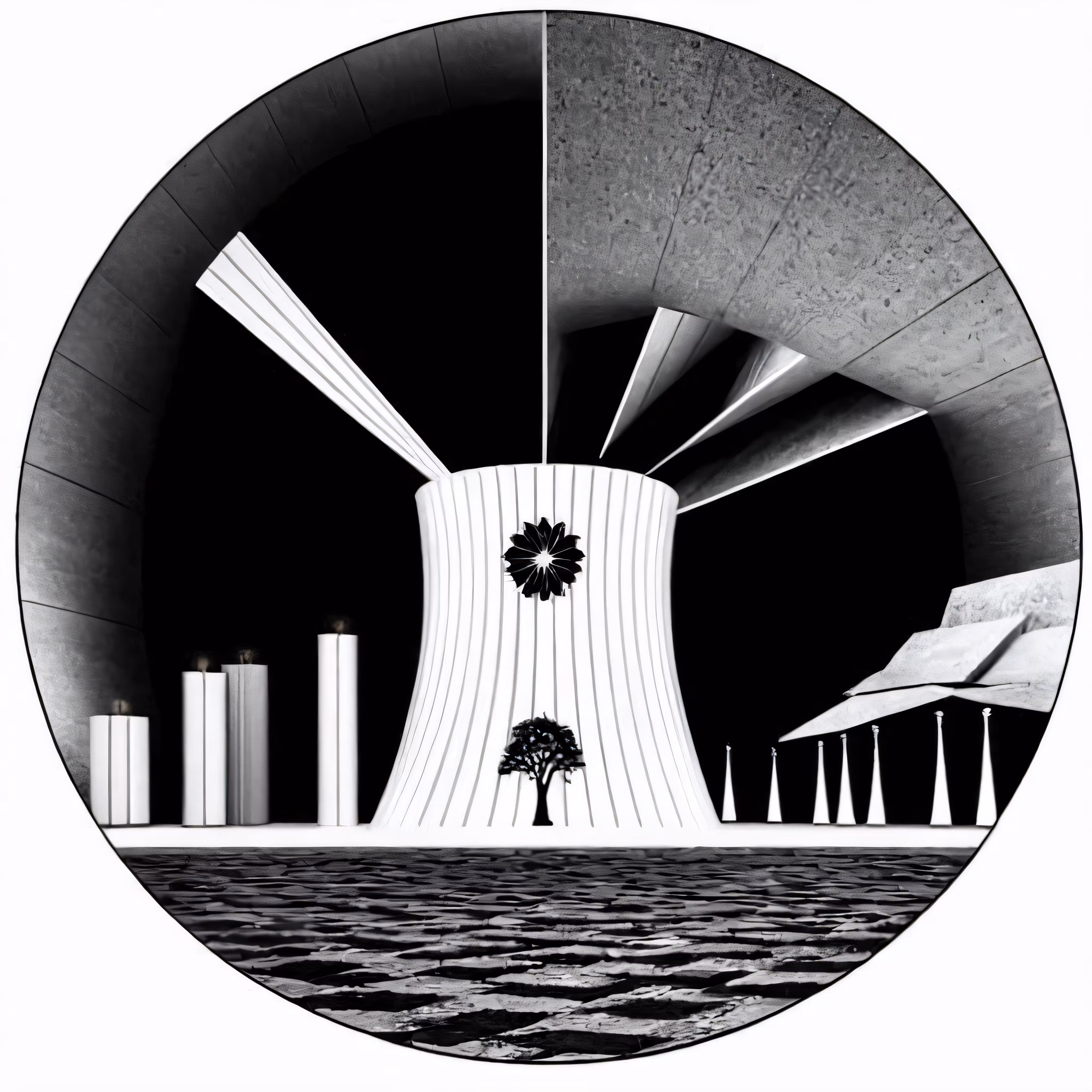 High resolution picture, free to use, black and white circular drawing of an urban landscape